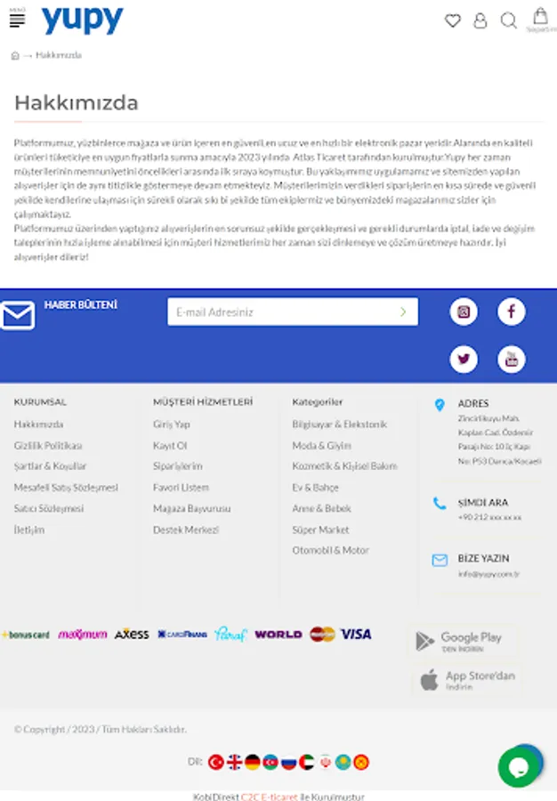 Our platform is the safest, cheapest and fastest electronic marketplace containing hundreds of thousands of stores and products. It was established by Atlas Ticaret in 2023 to offer the best quality products to the consumer at the most affordable prices. Yupy has always placed the satisfaction of its customers first among its priorities. We continue to show this approach with the same meticulousness for our application and shopping made on our site. All of our teams and our stores are working hard for you, so that the orders of our customers reach them as soon as possible and safely.