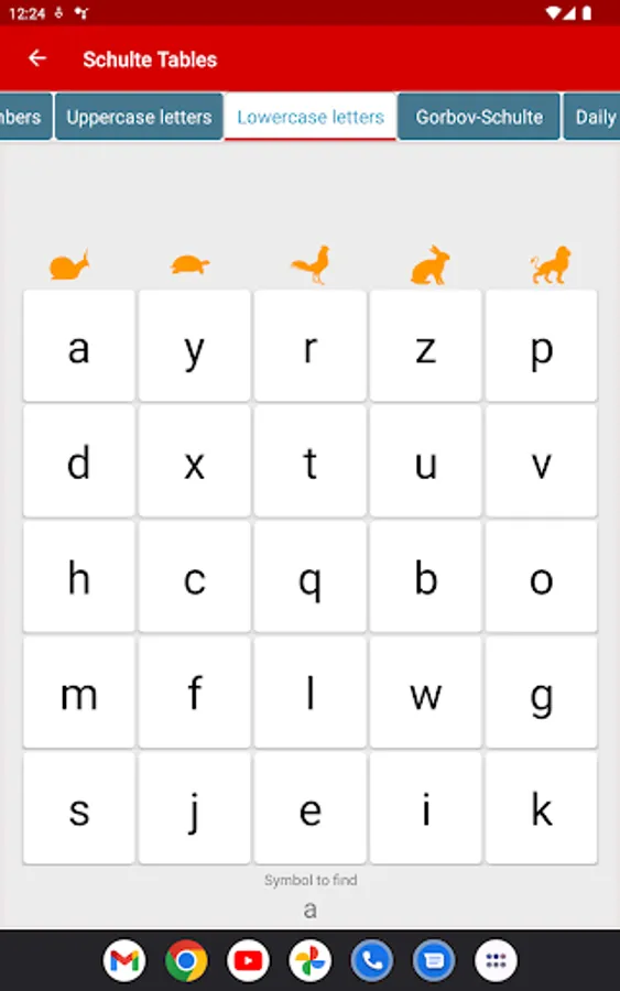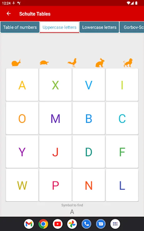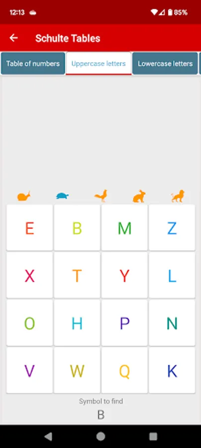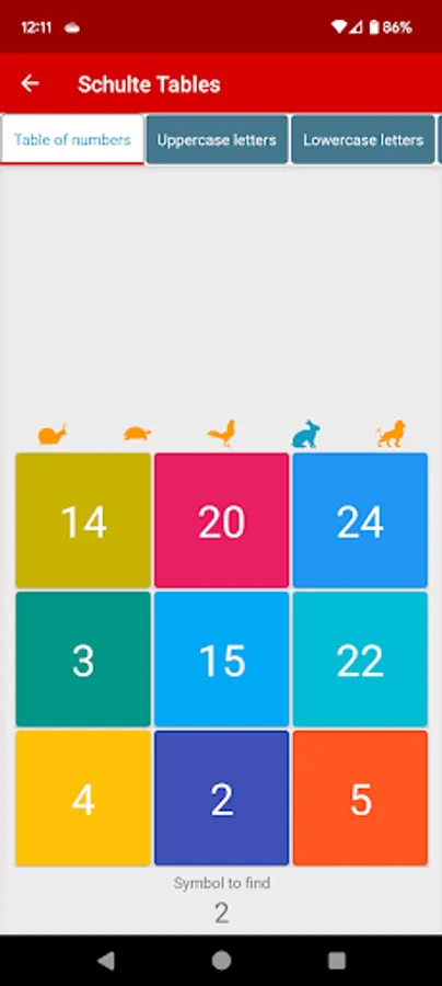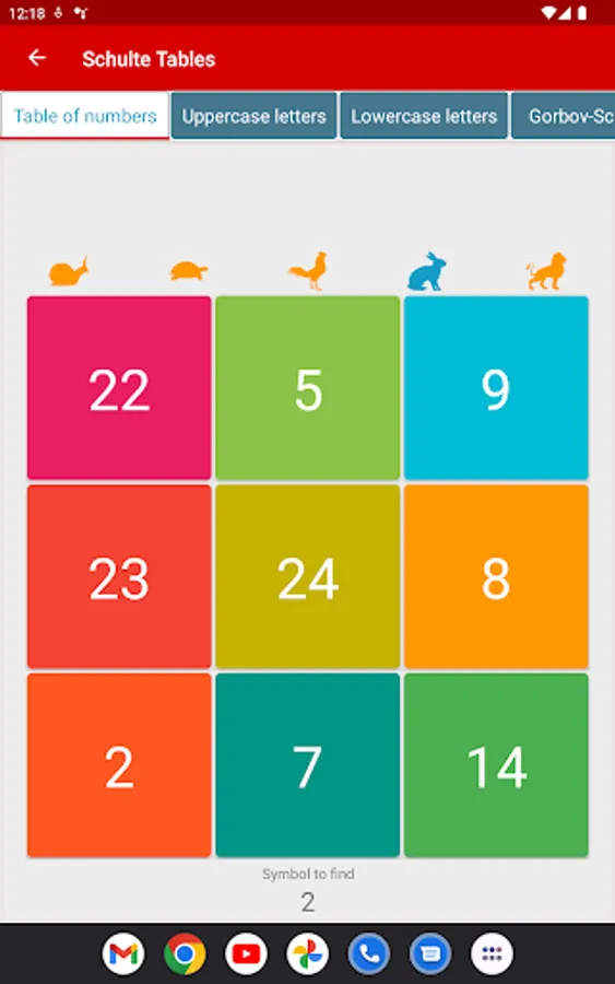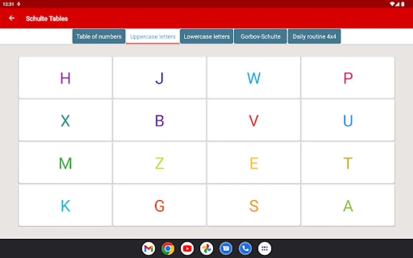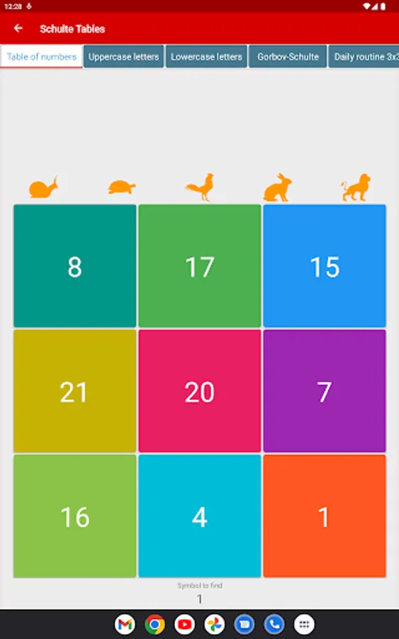 The peculiar thing about this app is that you can strengthen your brain while playing the game. All this in a fun way through tables, it's that easy. You just need to focus on the Schulte table, fix your attention on the center of it and start the ascending search for numbers or letters.