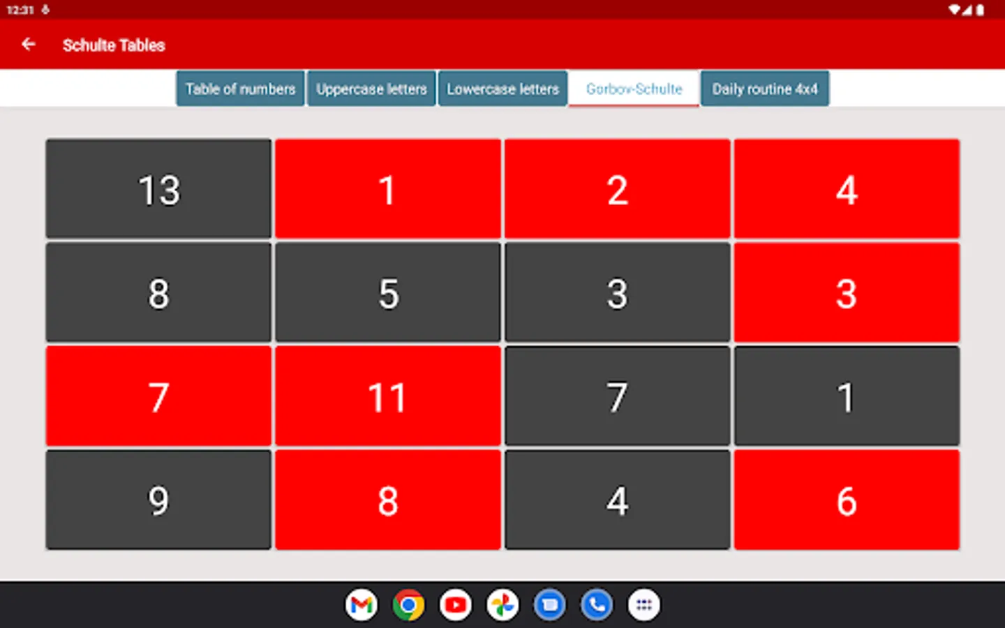 The Schulte table is one of the best apps to stimulate the brain. Among its benefits is the ability to improve concentration and promote memory development. It can even be used as an instrument to improve peripheral vision.