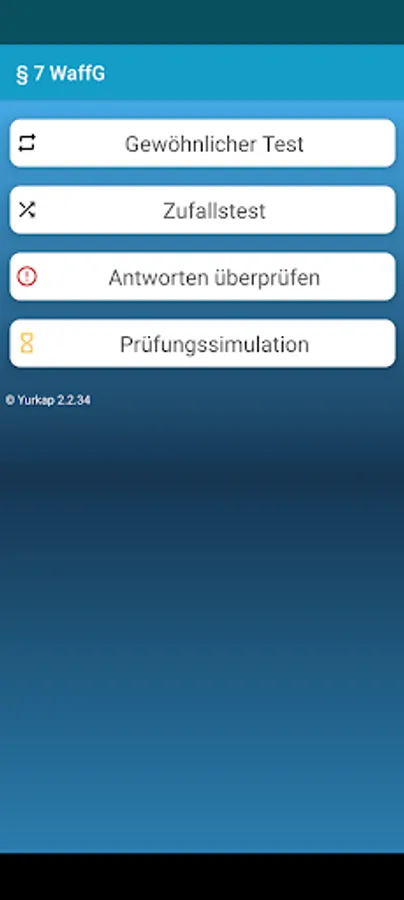 Weapon License Weapons Certificate Test Weapons Law (Status: 22.03.2022) is a very simple, clear and user-friendly app. The main window consists of two sections: Ordinary Test and Random Test.
