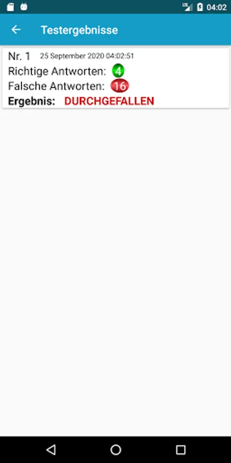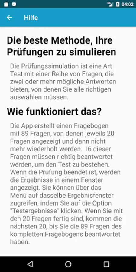 The app creates a questionnaire with 564 questions, of which 20 questions are displayed and then no longer repeated. 16 of these questions must be answered correctly to pass the test. When the test is finished, the results are displayed in a window. You can access the same results window from the menu by clicking on the "Test Results" option. When you finish the 20 questions, the next 20 come until you have answered the 564 questions of the full questionnaire.