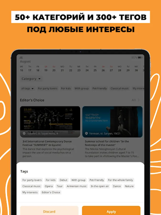 More than 70 types of events in 48 cities; now you can learn about everything that happens in Armenia: large-scale festivals and local holidays, business forums and scientific conferences, movie screenings and markets, concerts and exhibitions, parties and lectures, performances and workshops, stand-up and sports tournaments. Events for an audience of different ages and status, for the whole family or for a group of friends, available for visiting with animals and free of charge. Opportunity to customize the request according to individual filters and see what suits you personally.