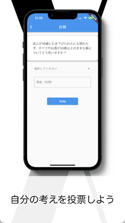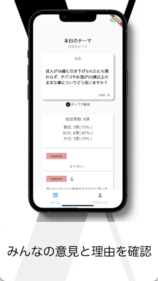 This app is an app that allows you to know what kind of thoughts you have in what field by expressing your opinion once a day on various subjects.