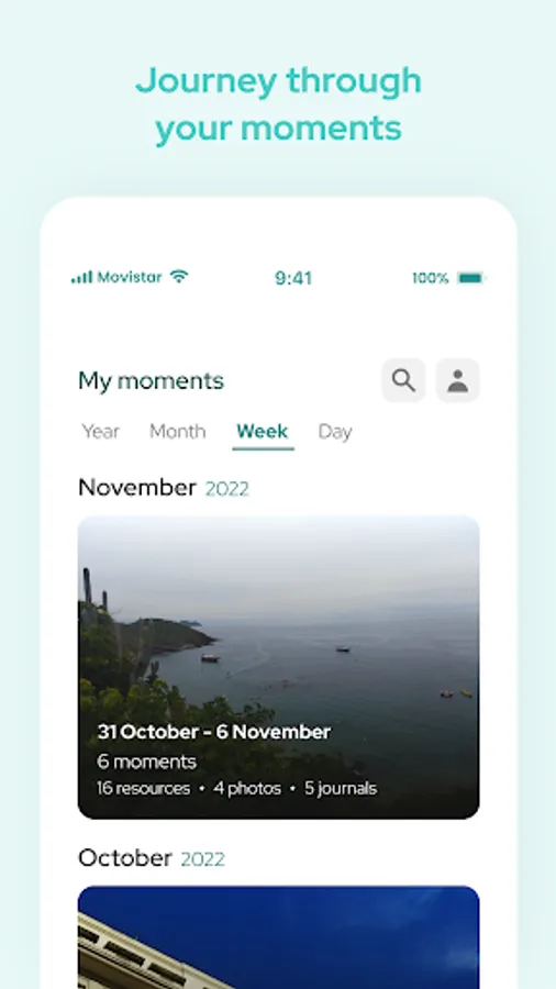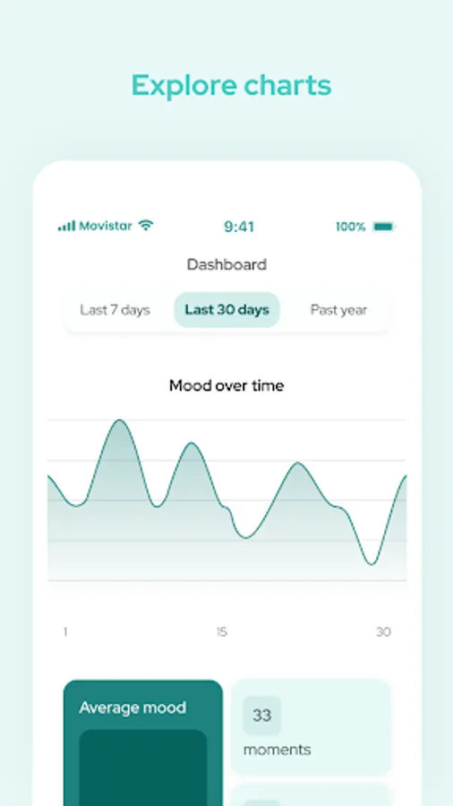 By reviewing your data using our analytics, you can keep track of your average scores, see changes over time, and make connections between people, places and activities and your overall mood. You can monitor how balanced your life is by how your moments are spread across different areas of your life, and see a whole year of moments in Year at a Glance.
