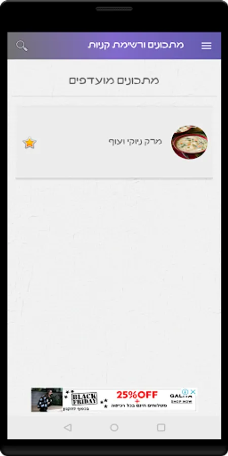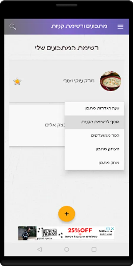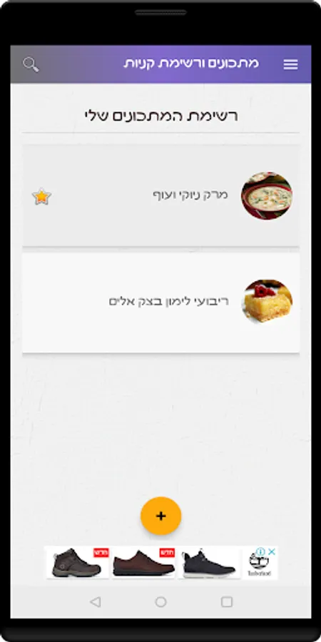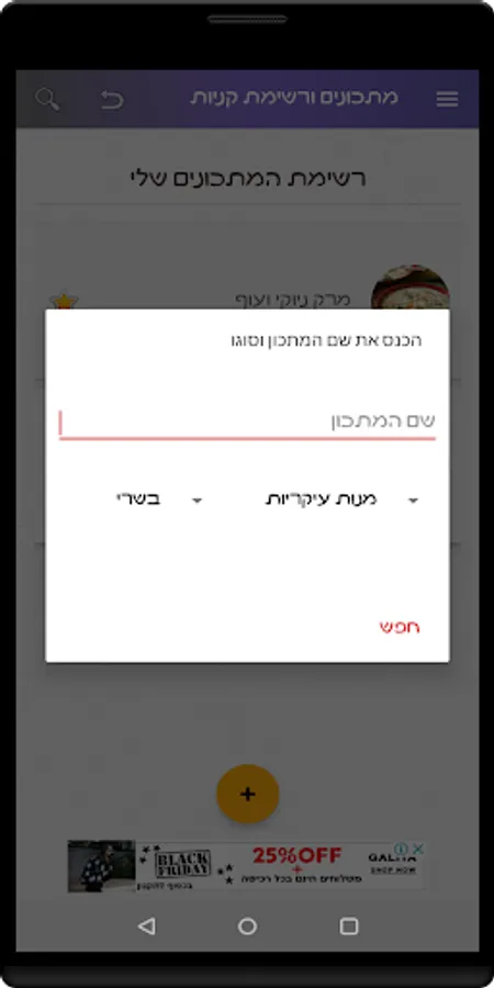 "Recipes and Shopping List" allows you to add your own recipes according to the type of dish (main course, first course, dessert, addition, fish, soups and pastries). Classification according to meat, dairy, fur, irrelevant.