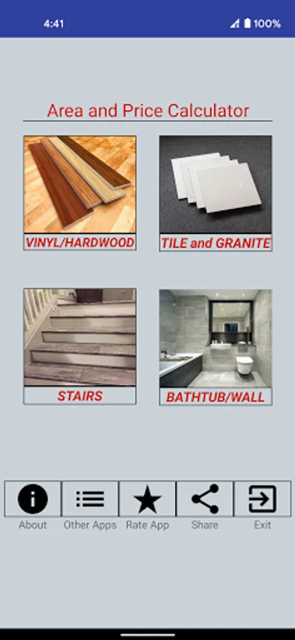 Simply click on specific image whether you want to calculate Tiles, Granite, Marbles, Vinyl, Hardwood, Stairs, Bathroom Tub and Bathroom wall coverings.