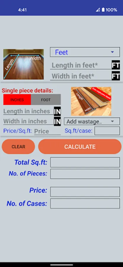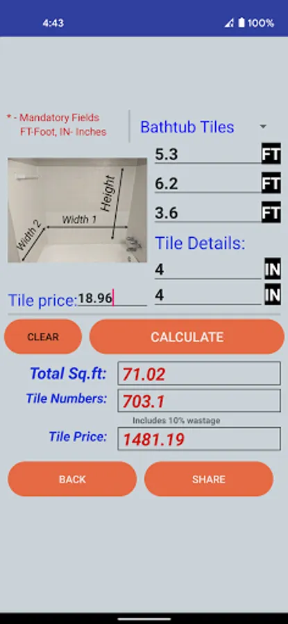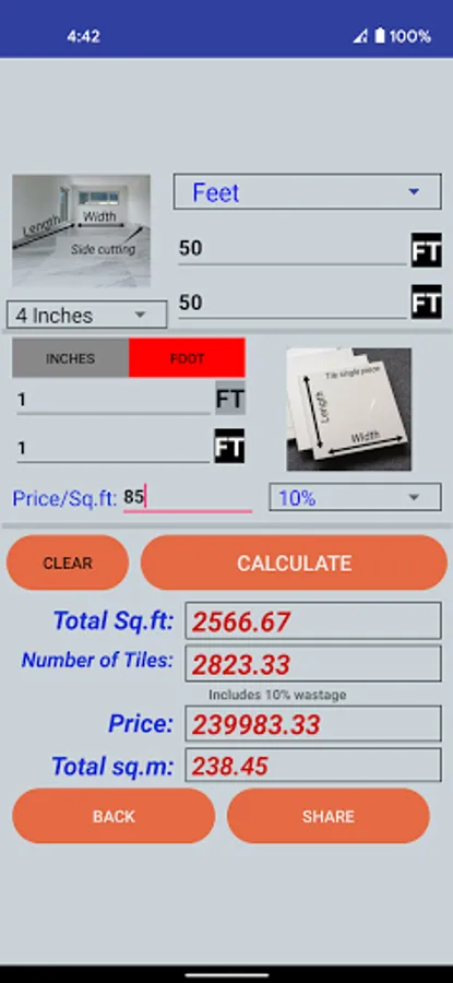 Enter room Length and Width which are mandatory fields and hit calculate just to see Area of you room and enter single piece(Tile) and Price details to see all calculated values instantly. Then use SAVE and VIEW button to store it locally in your mobile and view later.
