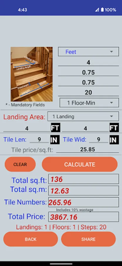 Stairs: First enter single stairs/step details as shown in image, it will give you entire area of your steps. Landing area mean where steps are wide and can be used for resting. Then enter material(piece) details to calculate it.