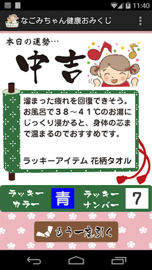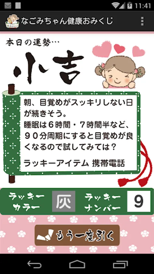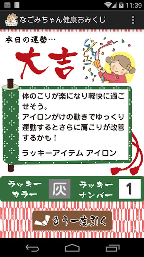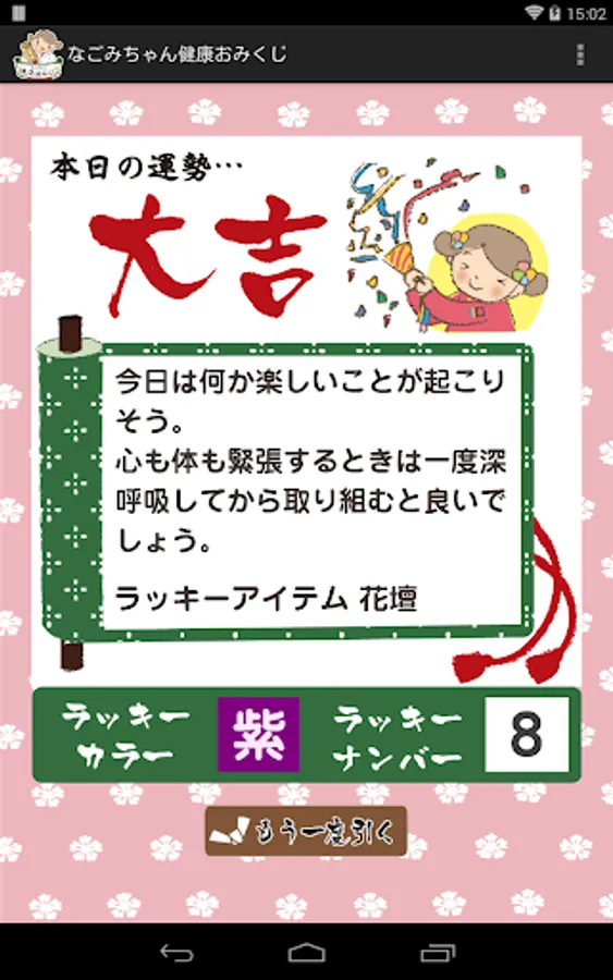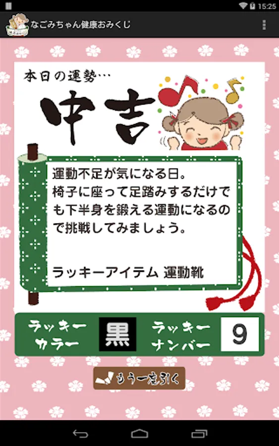 The result is displayed. How about having a day off from Nagomi-chan health omikuji at the start of the day.