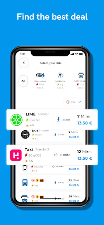 We work with most transport operators (Uber, Lime, Bolt, Taxi G7...). We have integrated more than 200 partners on our application to give you access to all possible transport options for your journey.