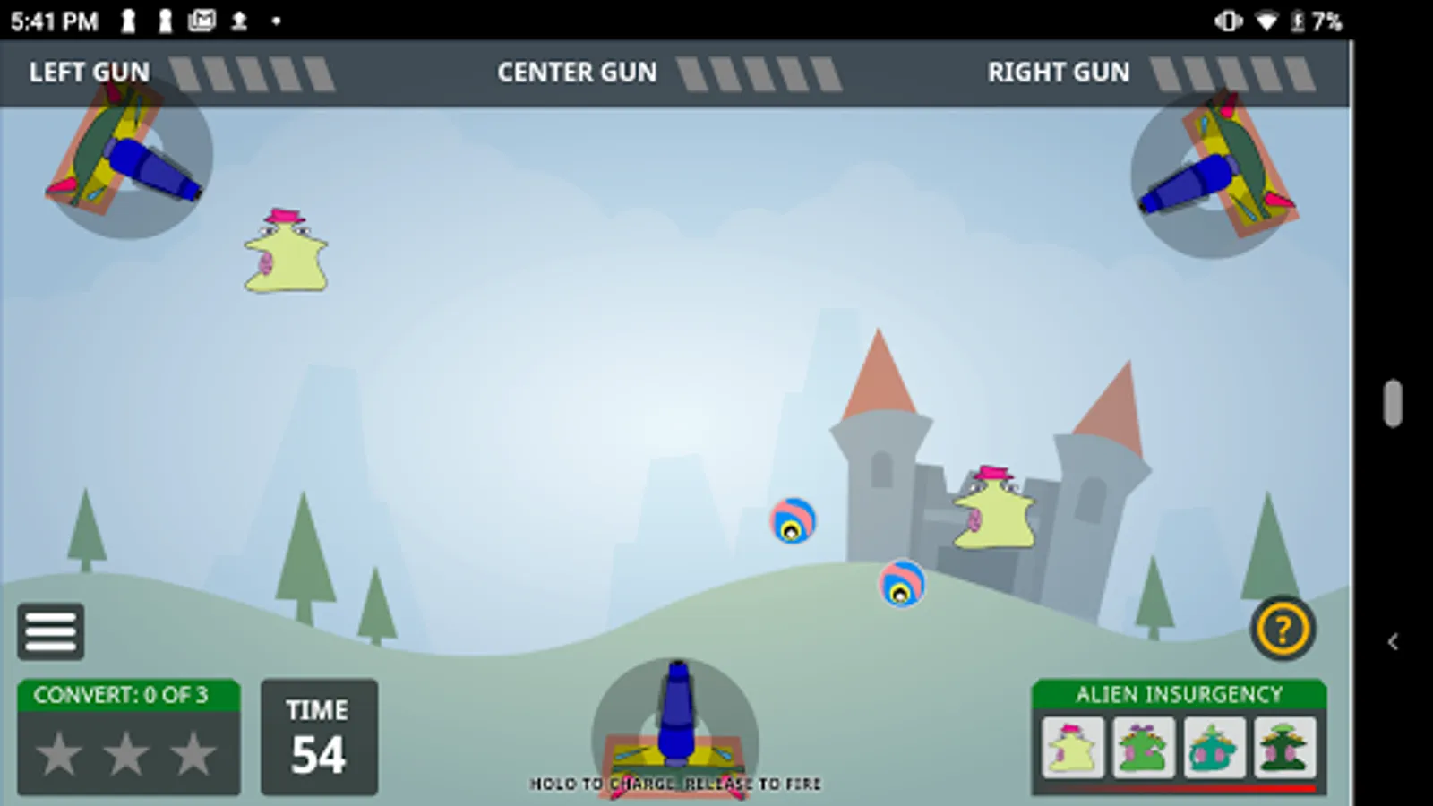 To fire a gun, press and hold until its charge (shown at the top of the screen) is at the level you want. With a full charge, the energy sphere is released at its maximum speed, whereas with just a tap, the energy sphere moves quite slowly.