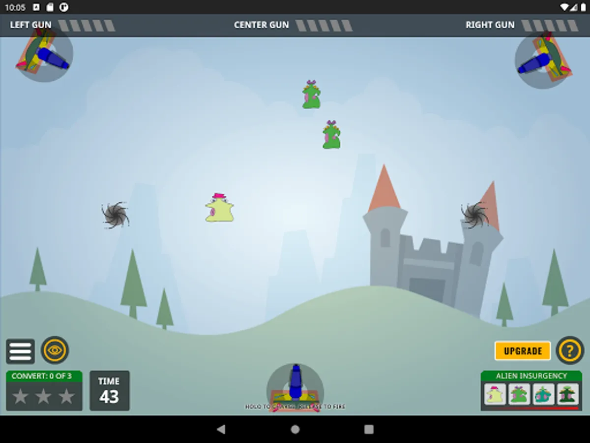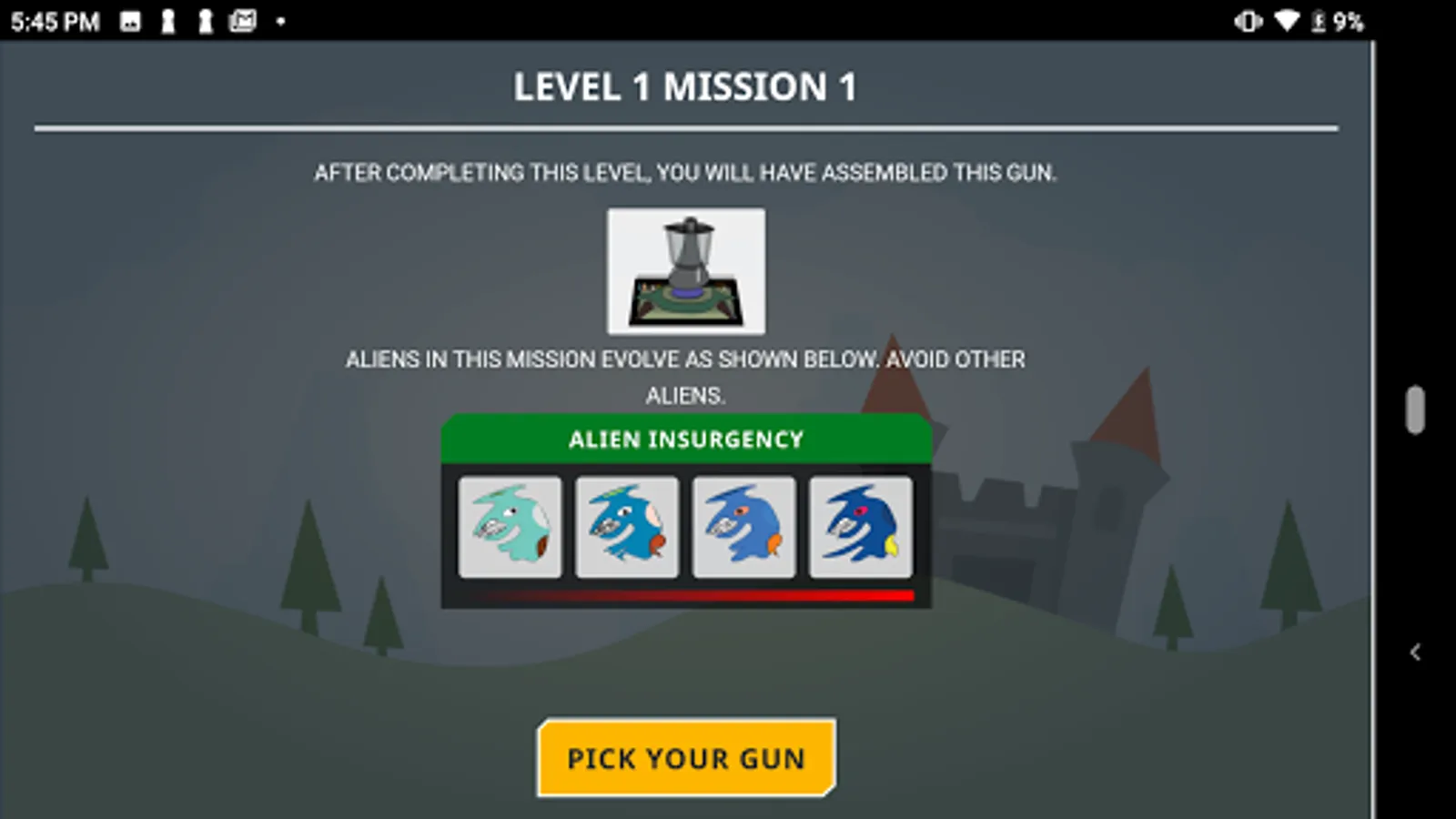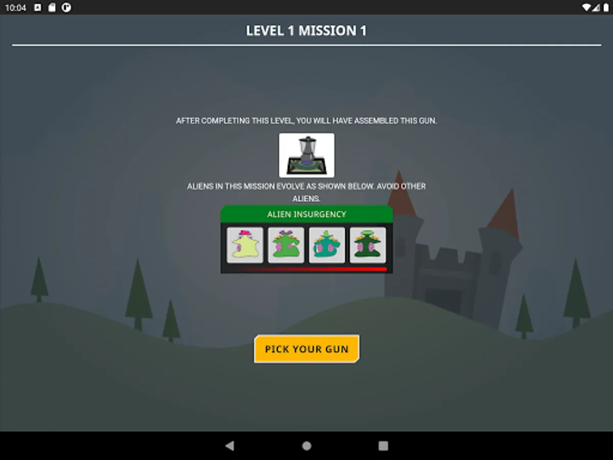 If you convert all the target aliens to their highest evolutionary stage before the timer runs out, you have completed that level, and you will receive a component that goes into the assembly of your next gun. There are ten components for each gun, and as you receive each component, you will see the gun start to take shape.