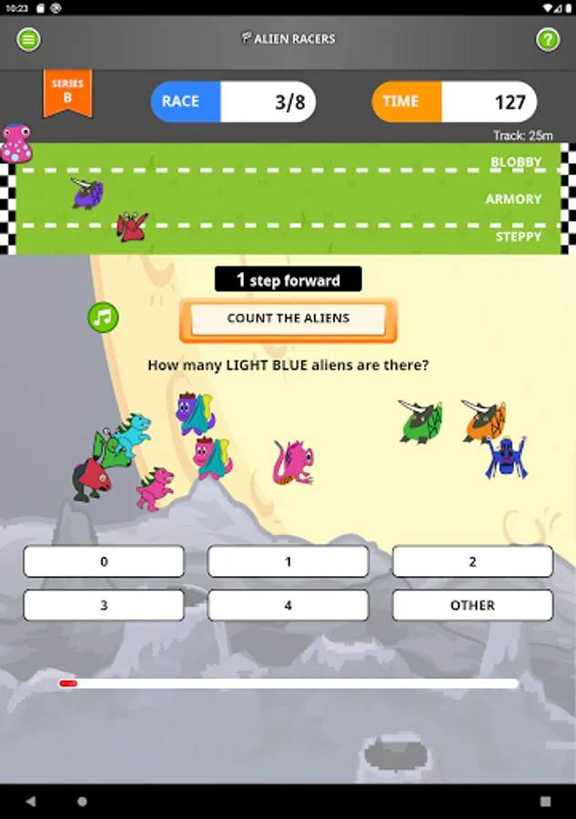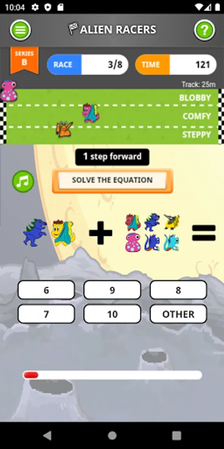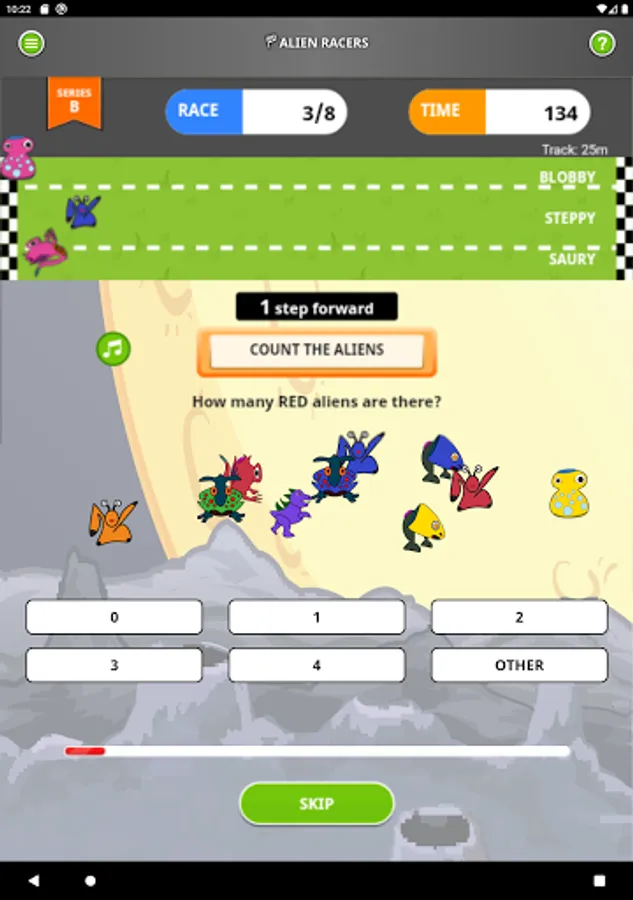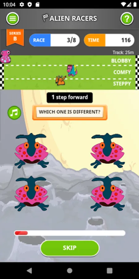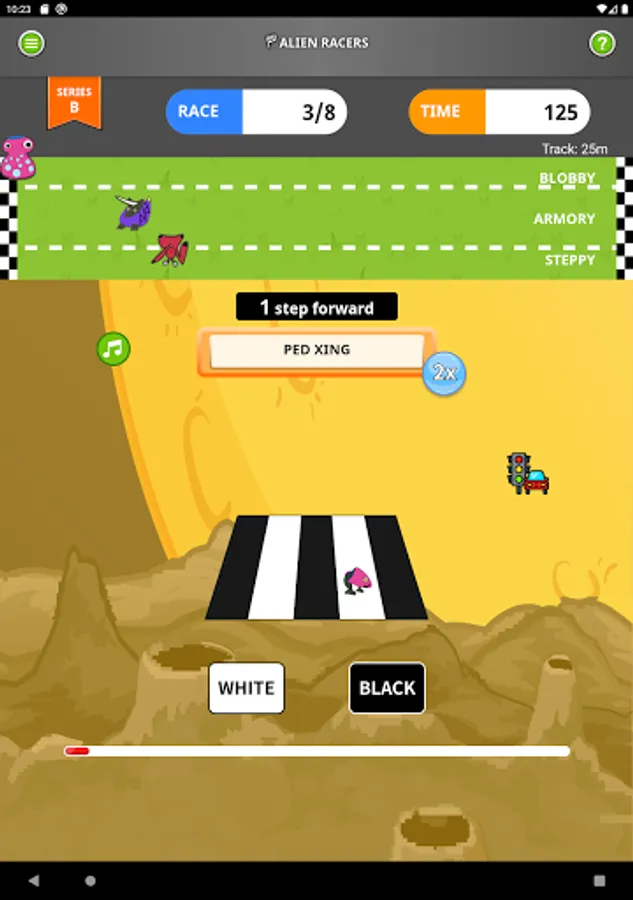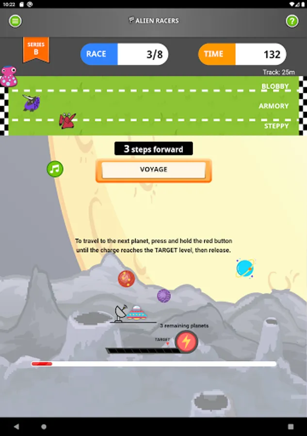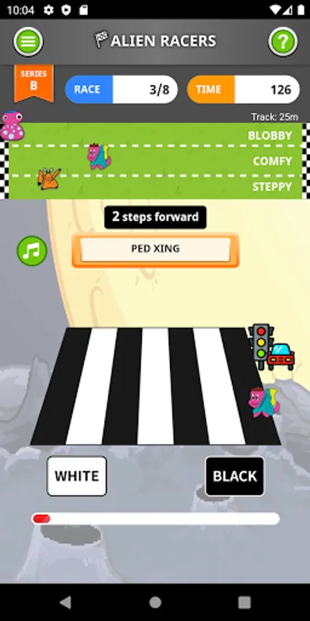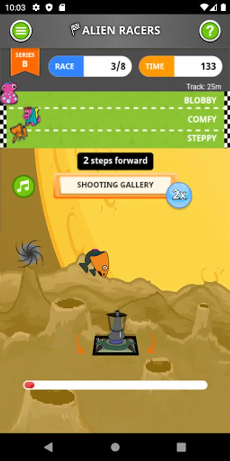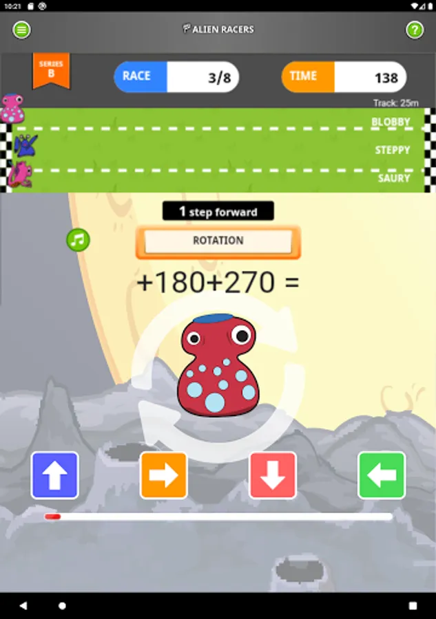 Each alien racer has a speed, where 1 is relatively slow, and 5 is fast. Like yourself, however, even fast racers may sometimes take a step backward, or jump on the spot, giving you a chance to win the race.