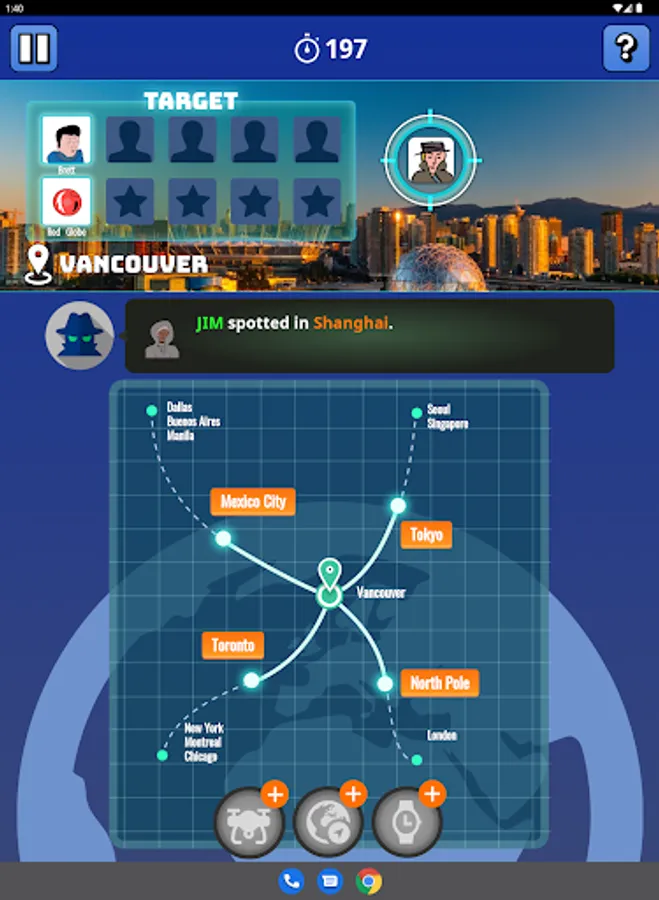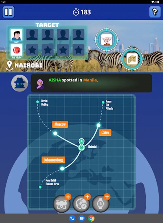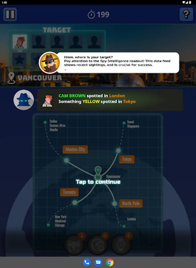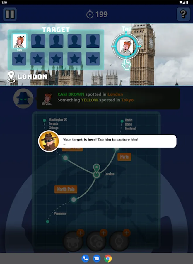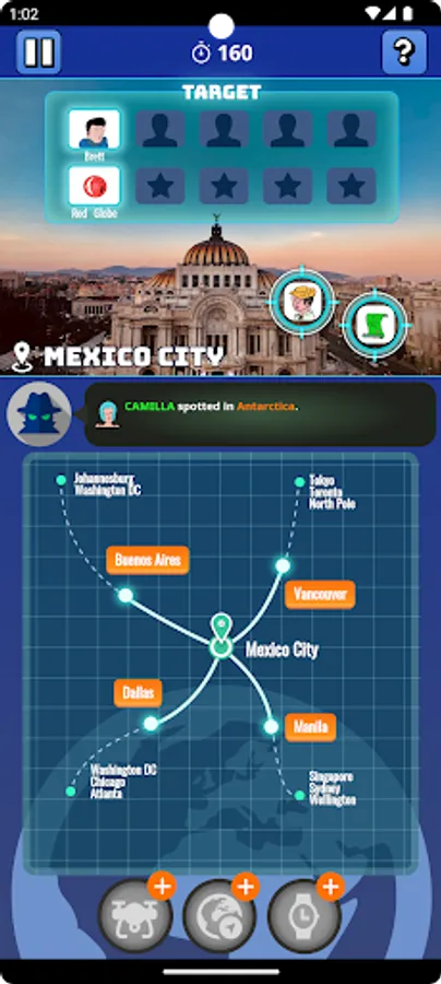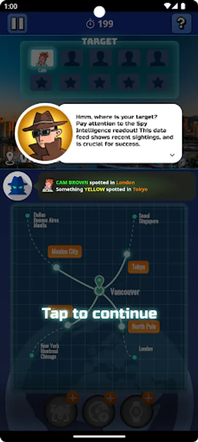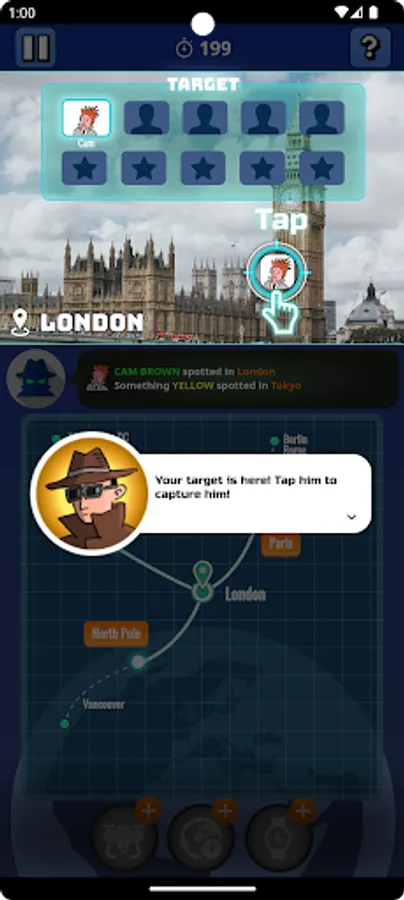 Your targets are indicated at the top of the screen. Tap the name of a city on the map to move there, and if you find your target spy or item there, tap on the target to capture it.