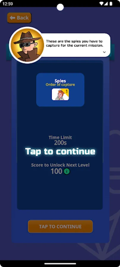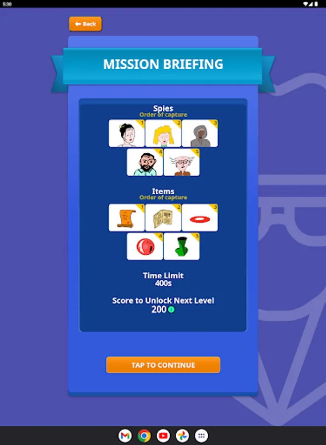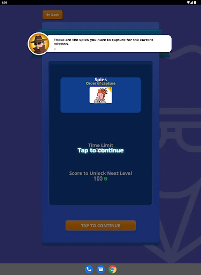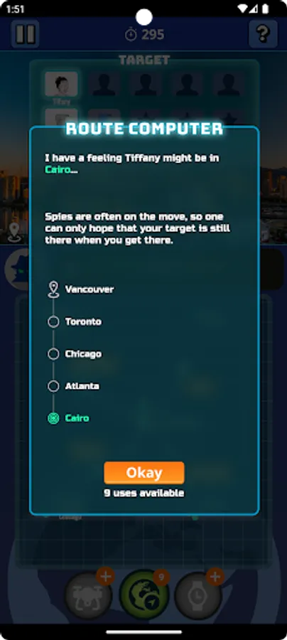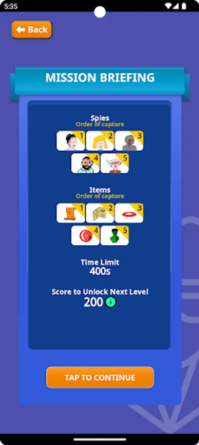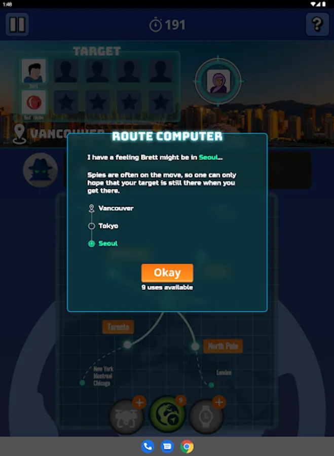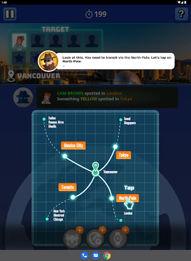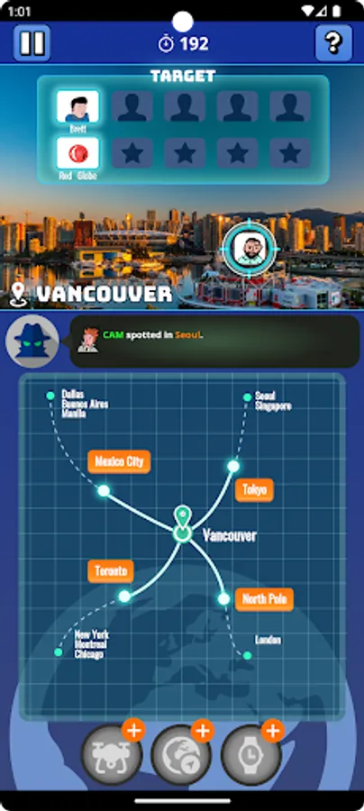 Your targets are indicated at the top of the screen. Tap the name of a city on the map to move there, and if you find your target spy or item there, tap on the target to capture it.