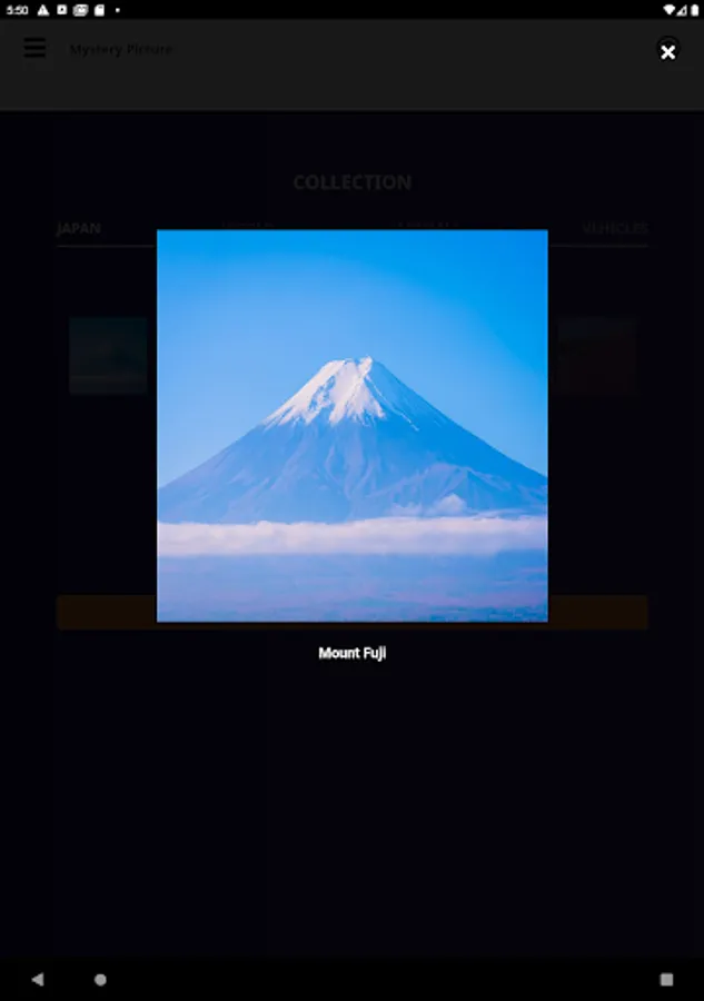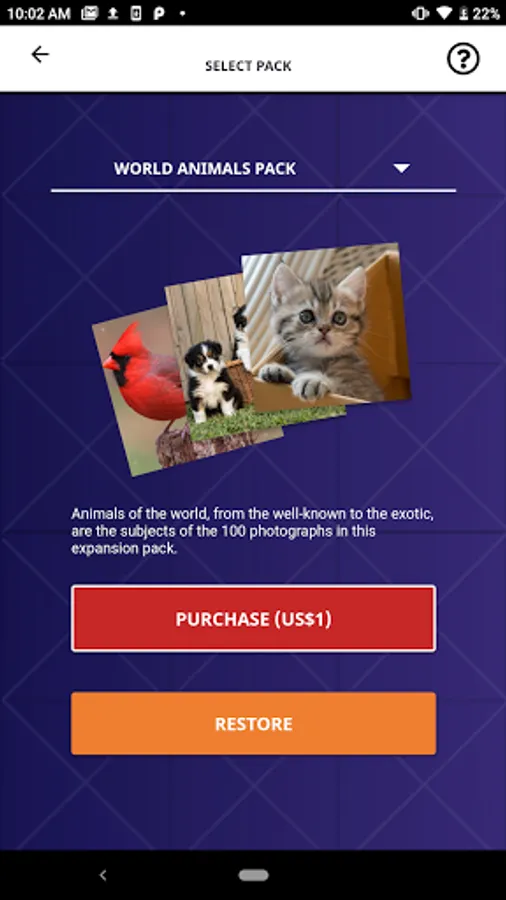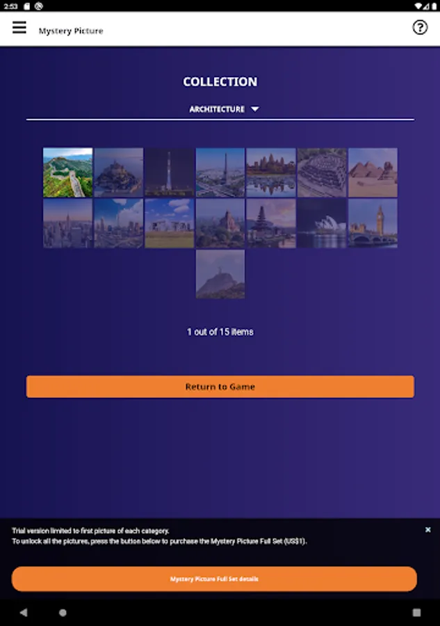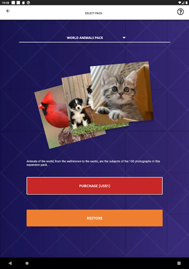 There are 20 pictures in the free version, and a total of 200 distinct pictures if you make an in-app purchase of the Mystery Picture Full Set expansion pack. Additionally, the other expansion packs (World Animals, Heritage Sites, World Travel and Transportation Vehicles) can be purchased to add a further 100 specialty images each.