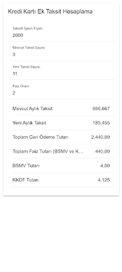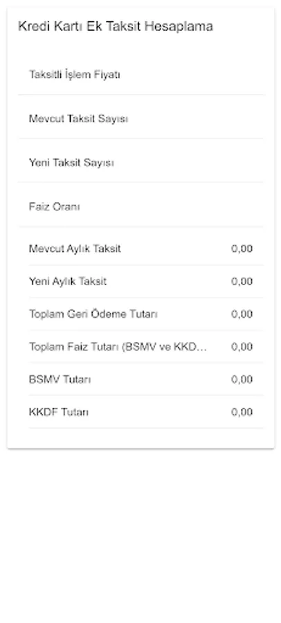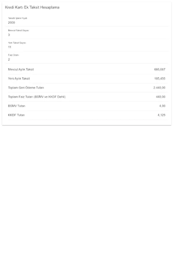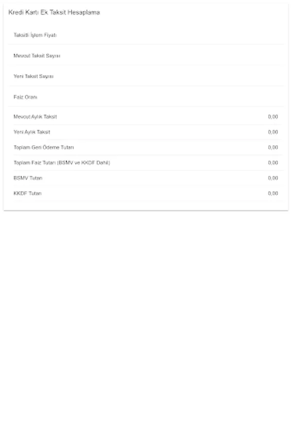 You can make Credit Card Additional Installment Calculation with our application. For this, it is sufficient to enter the Transaction Price in Installments, the Number of Current Installments, the Number of New Installments and the Interest Rate.