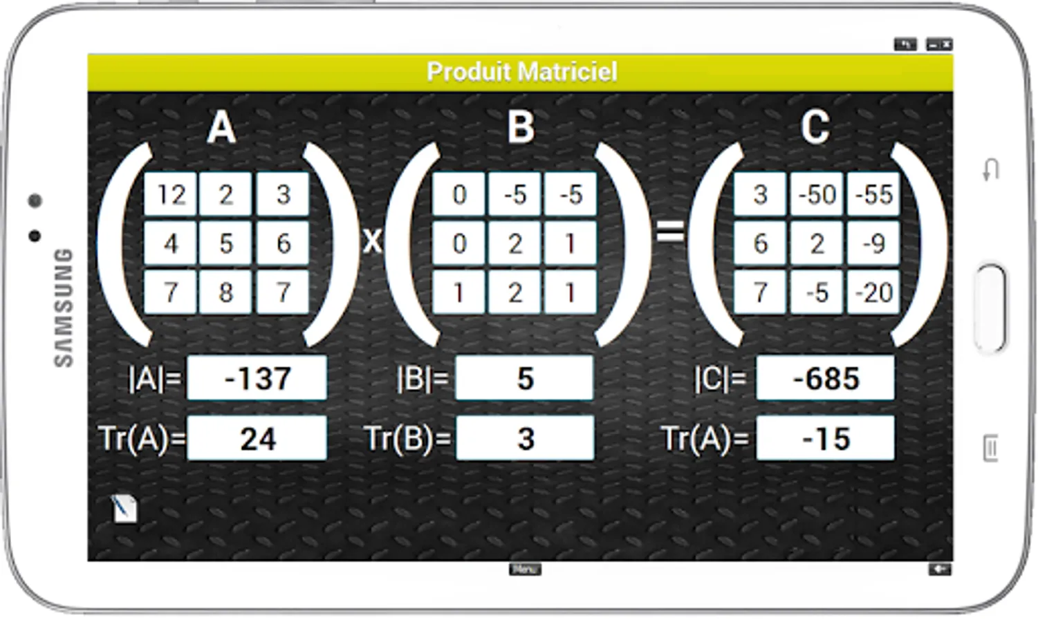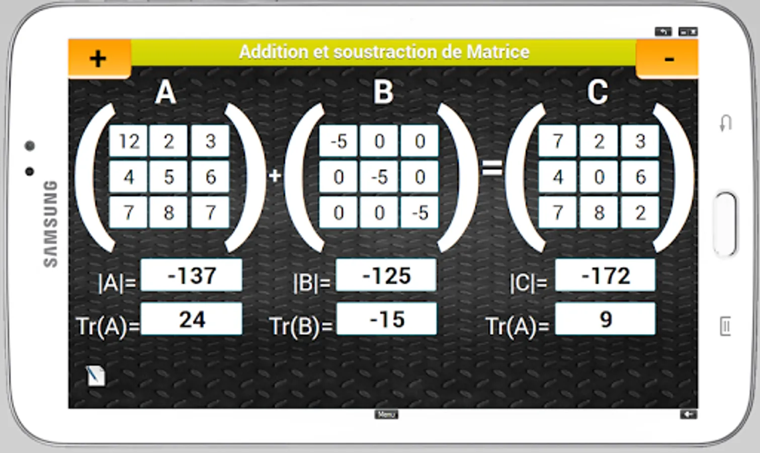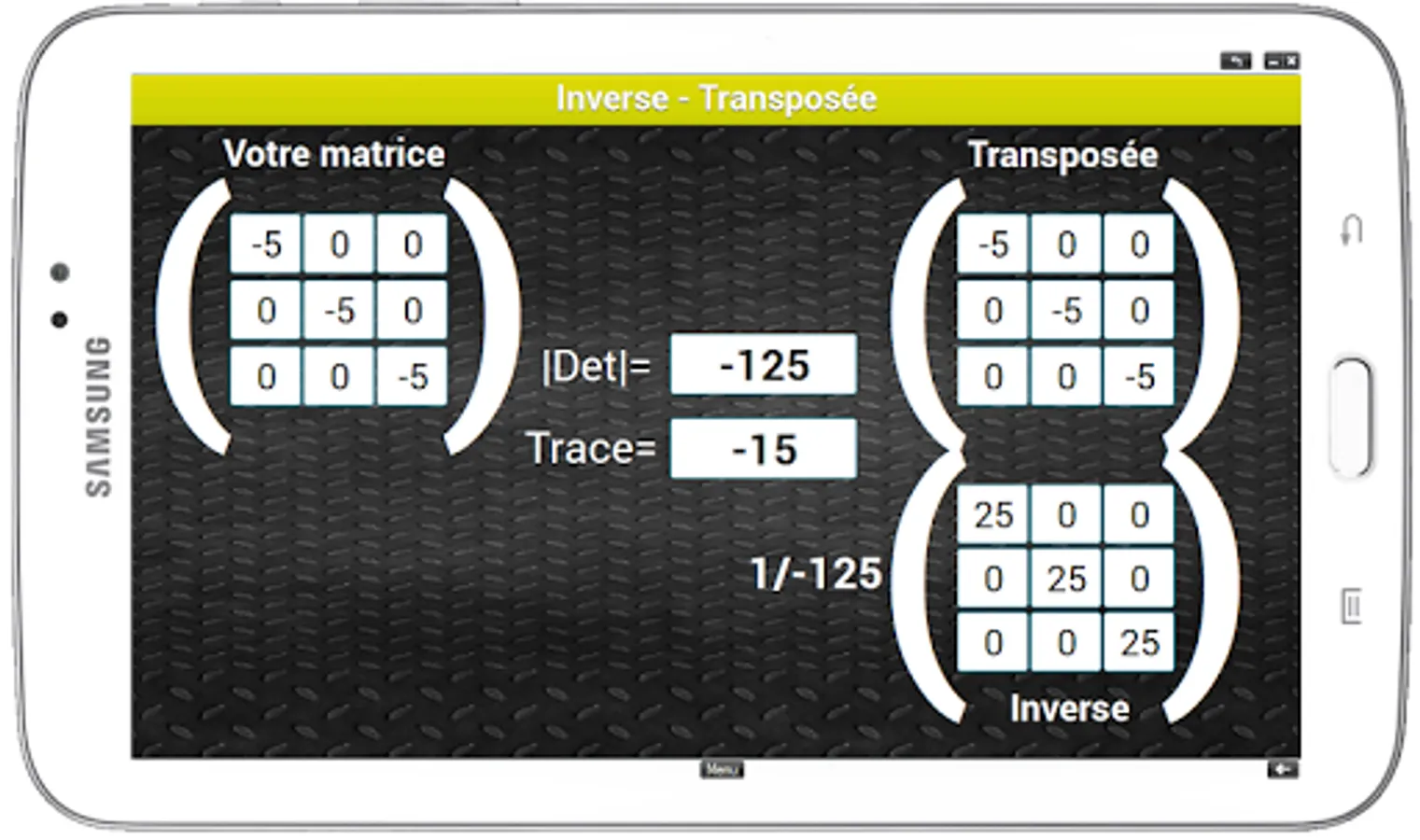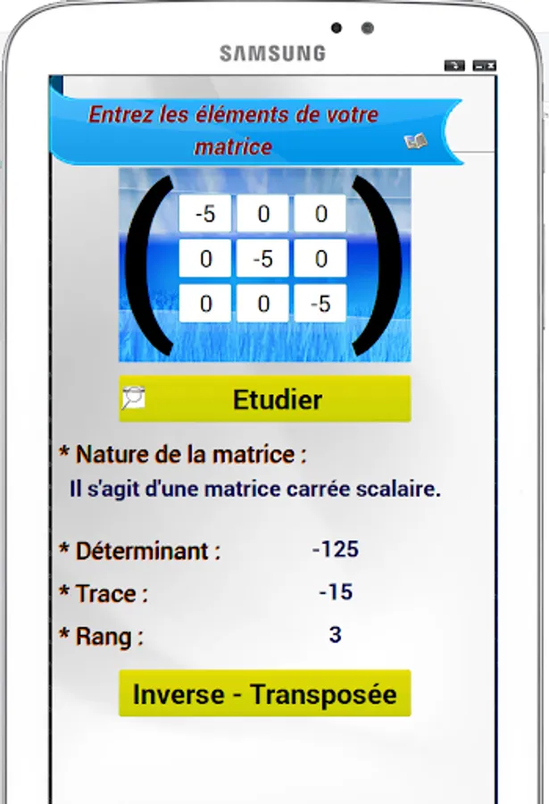 This mobile app serves as a calculator for the 3rd order square matrices for this release. It performs arithmetic operations such as addition, multiplication and matrix inverse and transpose. Not to mention the calculation of determinant and trace.