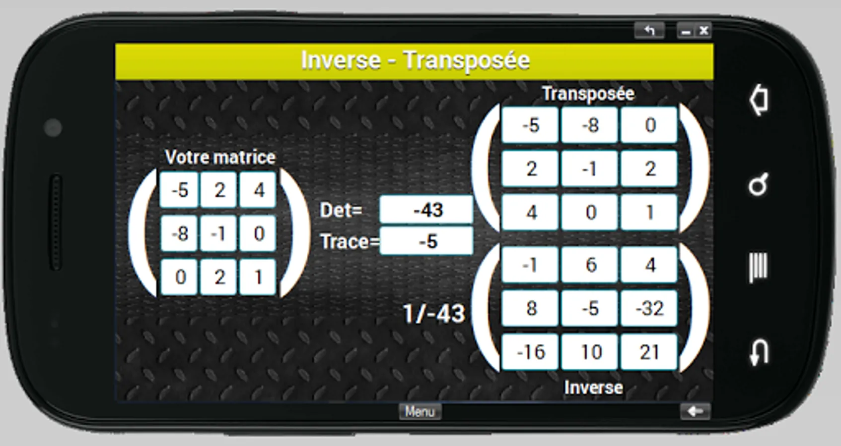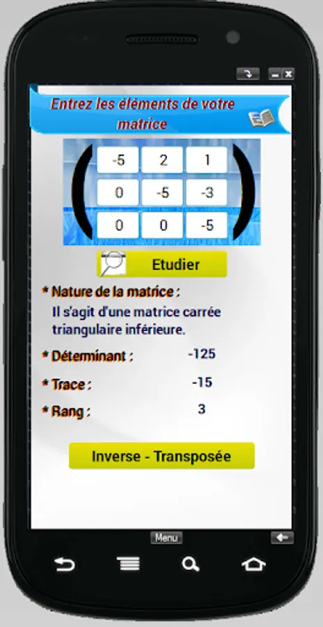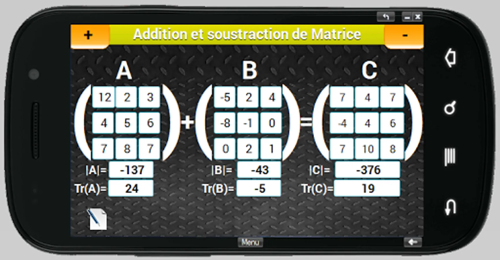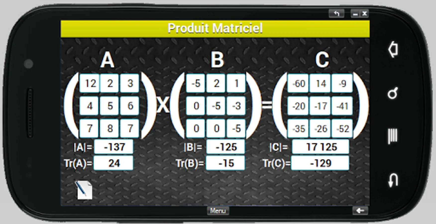 This mobile app serves as a calculator for the 3rd order square matrices for this release. It performs arithmetic operations such as addition, multiplication and matrix inverse and transpose. Not to mention the calculation of determinant and trace.