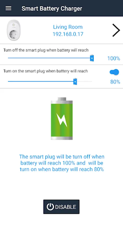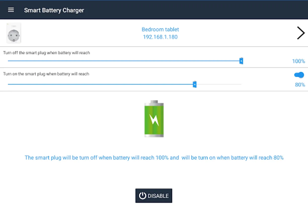 If like me you leave your phone to charge overnight then when the phone battery is fully charged, the charge is stopped and then resumed. This leads to a redundant cycle which in the long run will shorten the life of your battery. This is why I created this application to stop the charging of your smartphone when the battery is fully charged. To allow the charging of your phone to stop, you need a smartplug on which you will put your phone's charger. Then simply open the Smart Battery Charger application, find your smartplug by putting your phone on the same wifi network as your smartplug and then select it. All you have to do is press the Activate button and your smartplug will automatically turn off when your battery is fully charged.