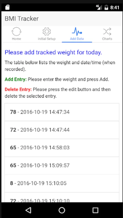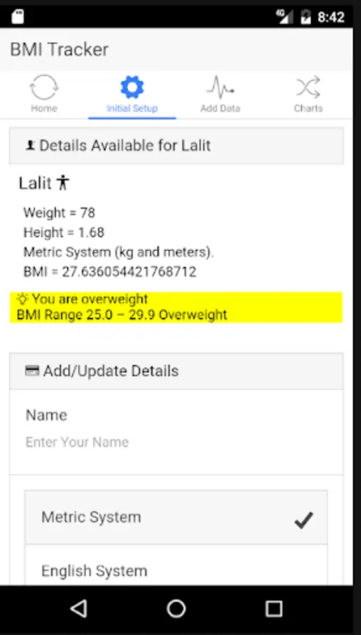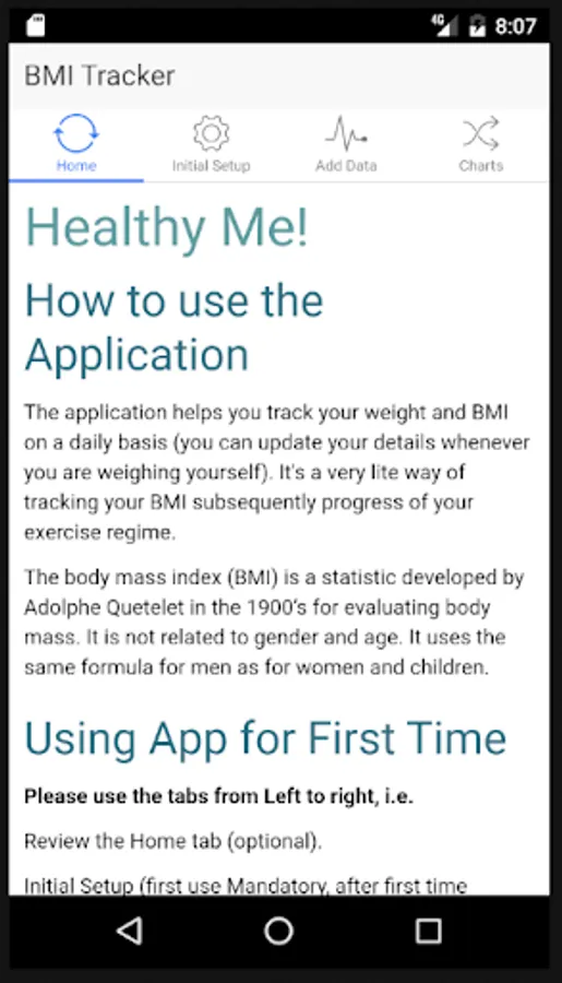 The application helps you track your weight and BMI on a daily basis (you can update your details whenever you are weighing yourself). It's a very lite way of tracking your BMI subsequently progress of your exercise regime.