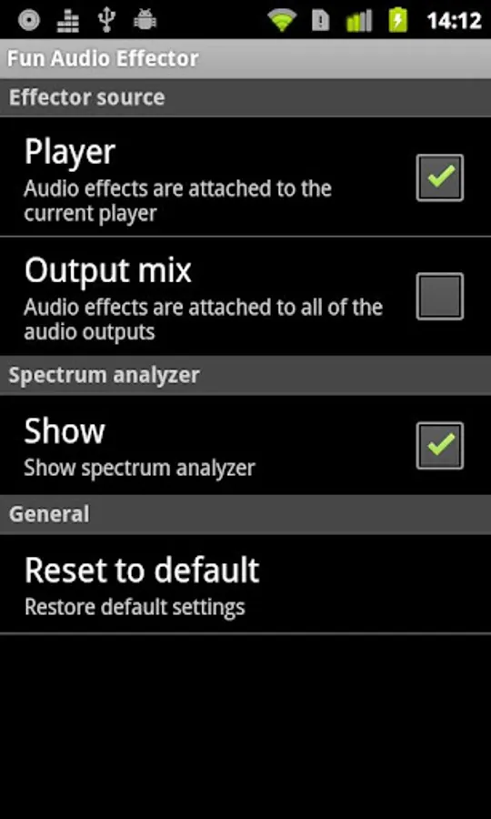 - 2 effector source modes: Player mode for the current media player, and Output mix mode for any audio outputs