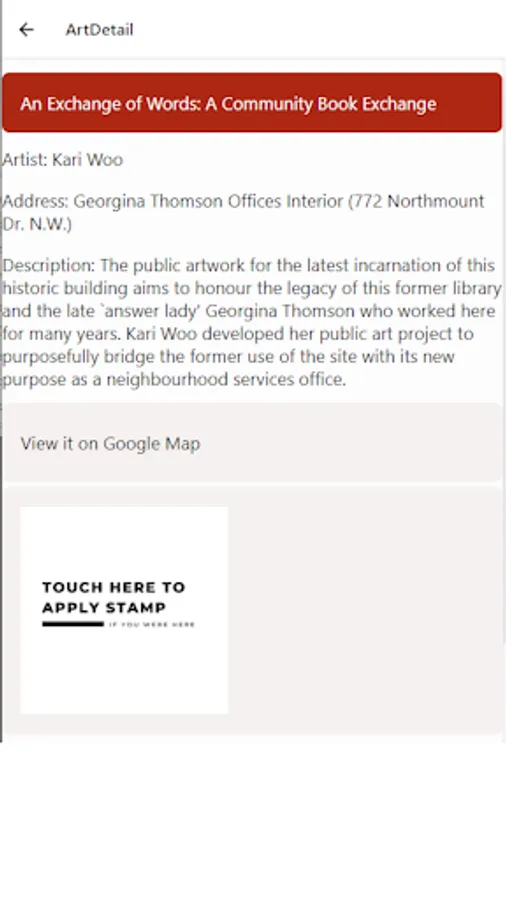 - Ability to apply a stamp that you have visited the location on each of the public art detail page.