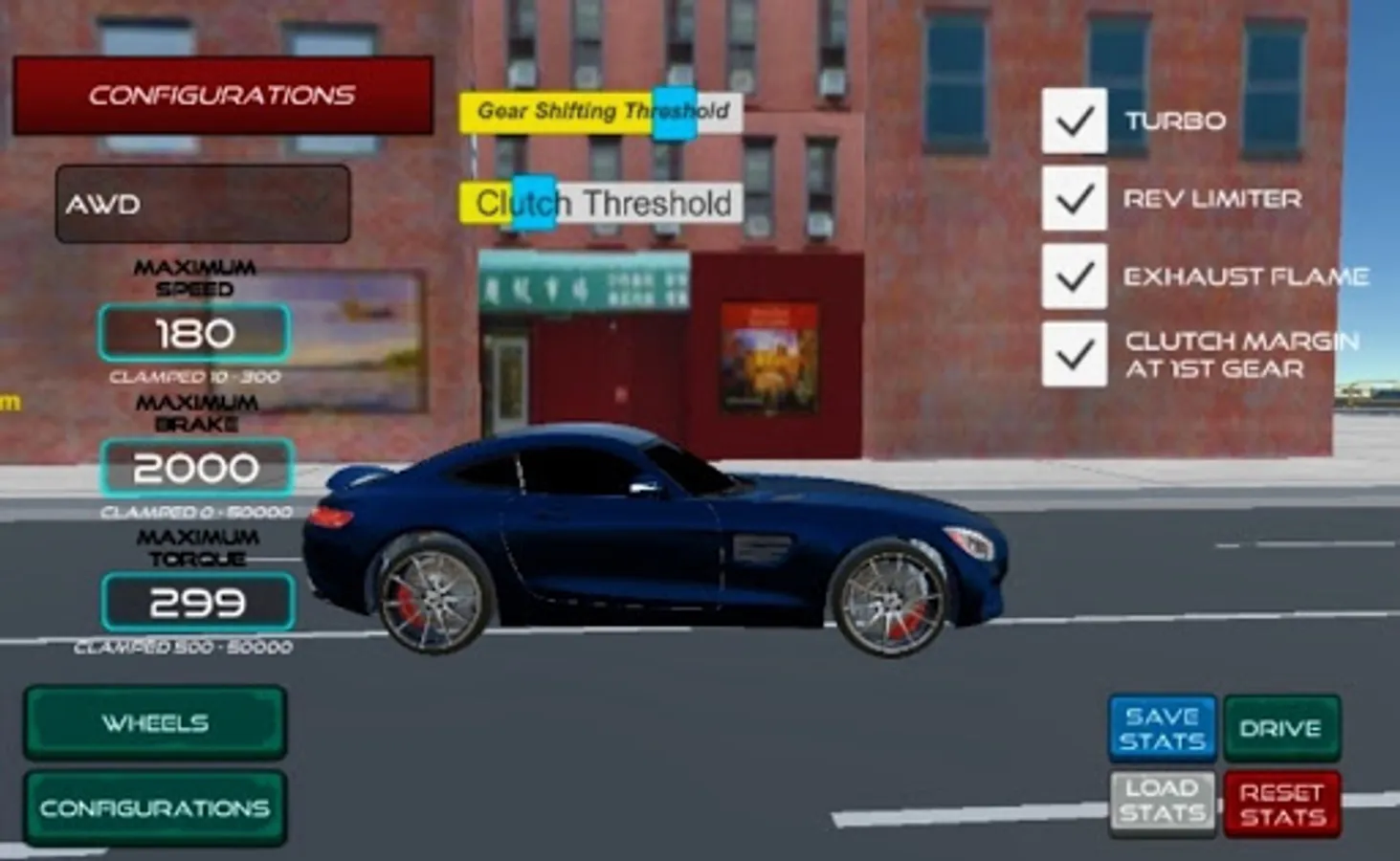You can set your car's Maximum Speed, Maximum Torque, and Maximum Brake power in-game.
