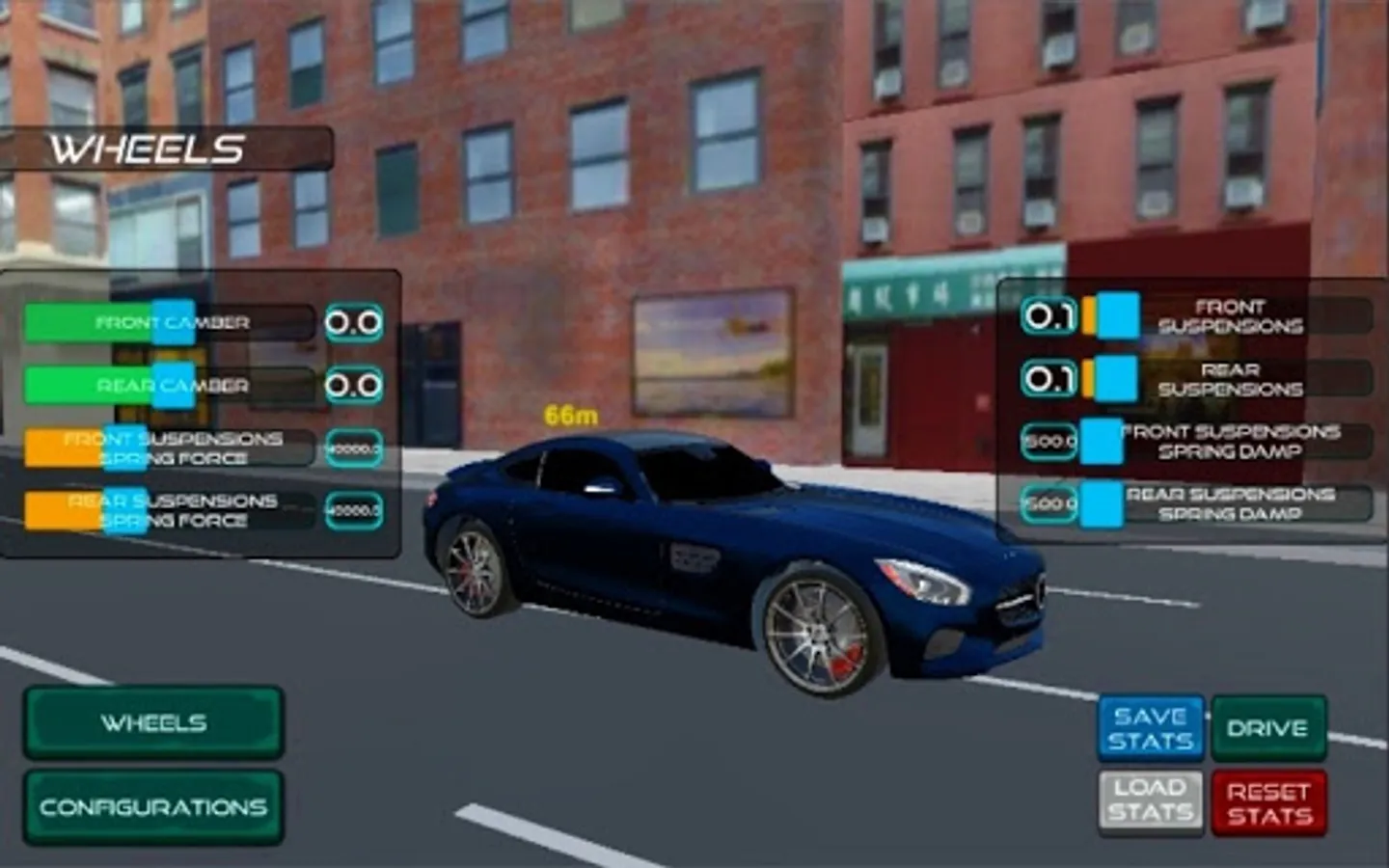 You can drive a car with different modification options. To make the car more enjoyable, you can turn off some steering assist features (ABS (Anti-lock Braking System), ESP (Electronic Stability Program) and TCS (Traction Control System)).