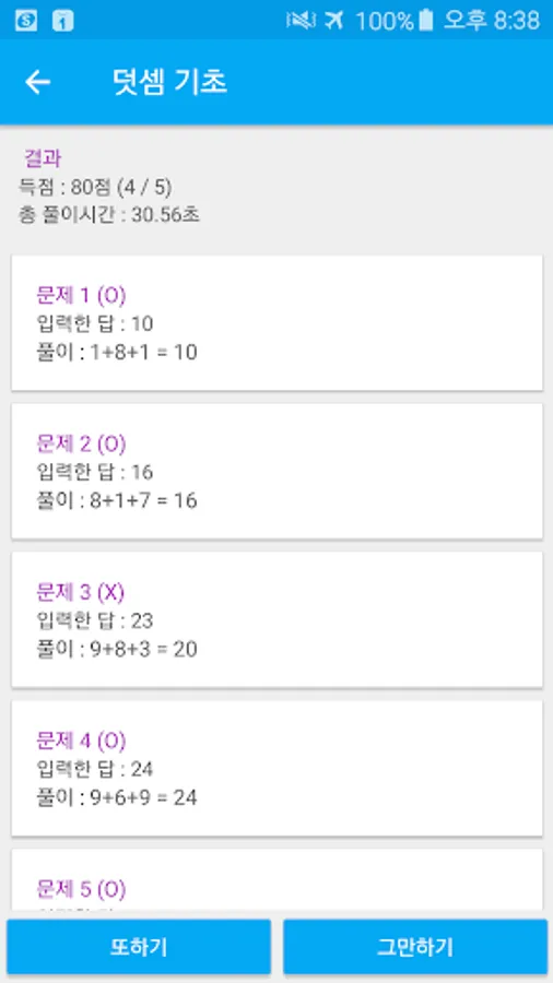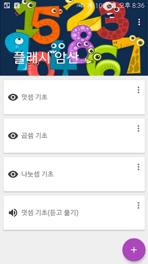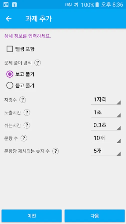 1. The type of problem (addition, division, multiplication), the number of digits, exposure time, questions sudeung allows users to perform a task made freely set as desired.