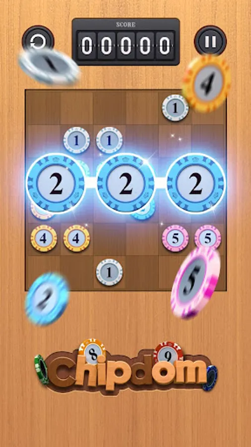 1. Place three game chips(or more) with the same number next to each other to merge them, horizontally, vertically, or both.