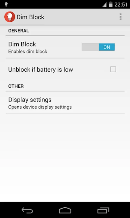 Dim Block is a simple application that stops your screen from dimming with one click. It is very easy to use and has a features for stop blocking dim on low battery and one-click opening of display settings.