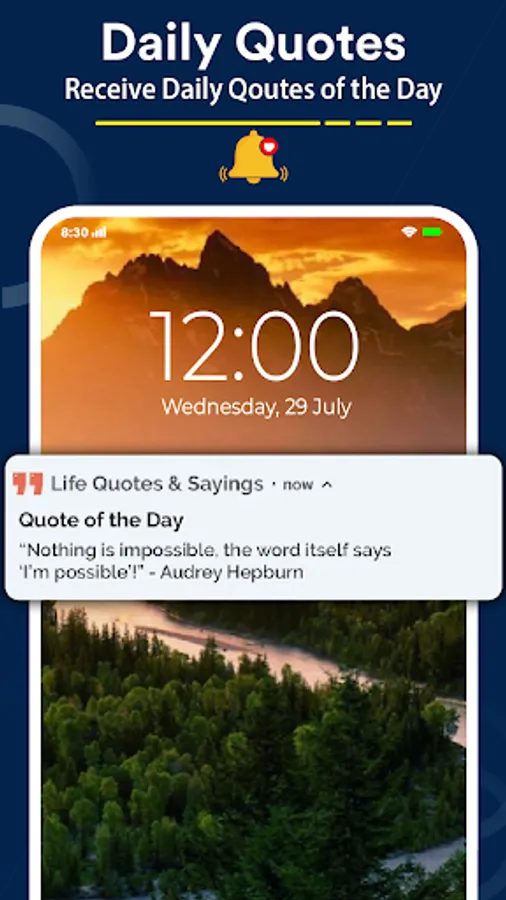 A huge collection of Daily Quotes, thoughts of the day, and motivational quotes in English to make you humble, and dream big, in this Daily Quotes and Blessings app. Daily Quotes widget positive life quotes to find hope & light in the darkness. Daily quotes reminder gives positive life quotes for a more peaceful life. Thank you quote to show gratitude. Daily Quotes Maker or daily quotes app with photo allows you to change the background of quotes easily with your picture or others and also write your quote and save it into the positive good morning quotes app.