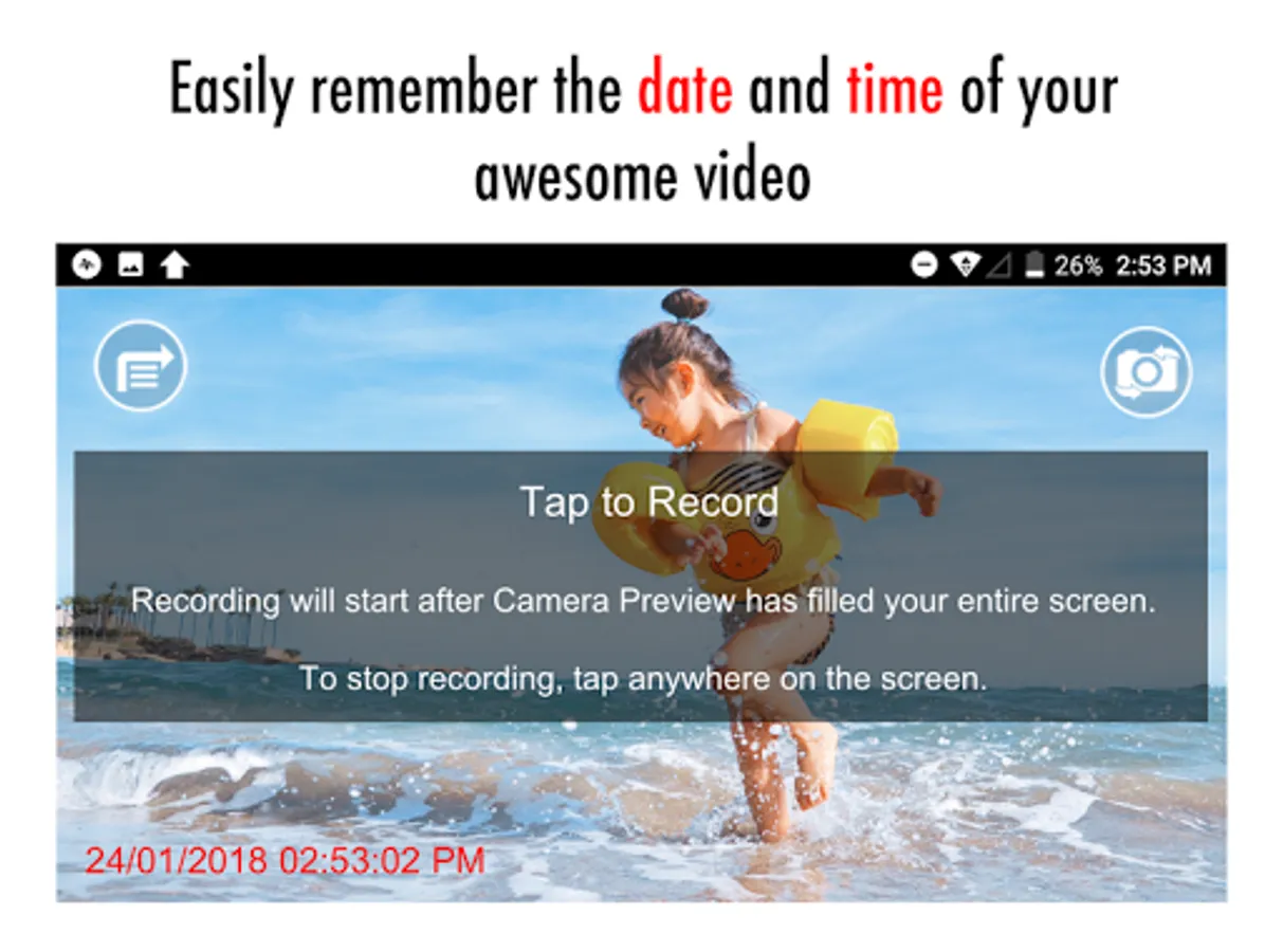 Video Timestamp uses screen capture without requiring root permission (Android 5.0 and above only) to create video with timestamp.