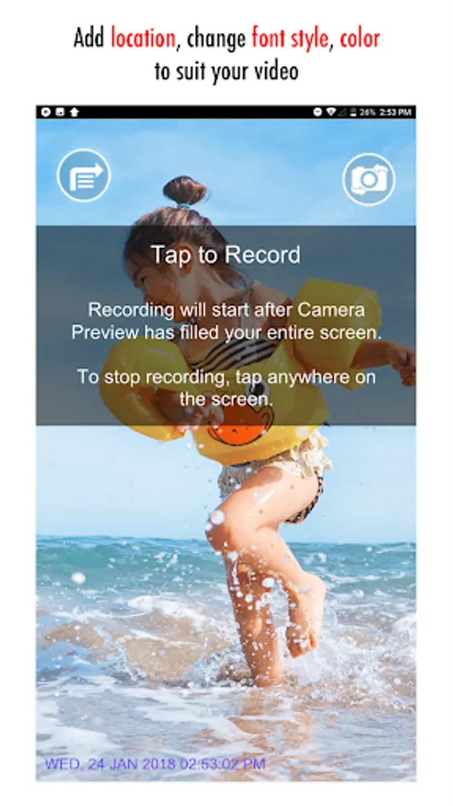 Video Timestamp can add date, time and location watermark to live video being recorded. It's extremely simple to use and no post processing is required. You can drag the timestamp across screen to place it where you want it on the recording.