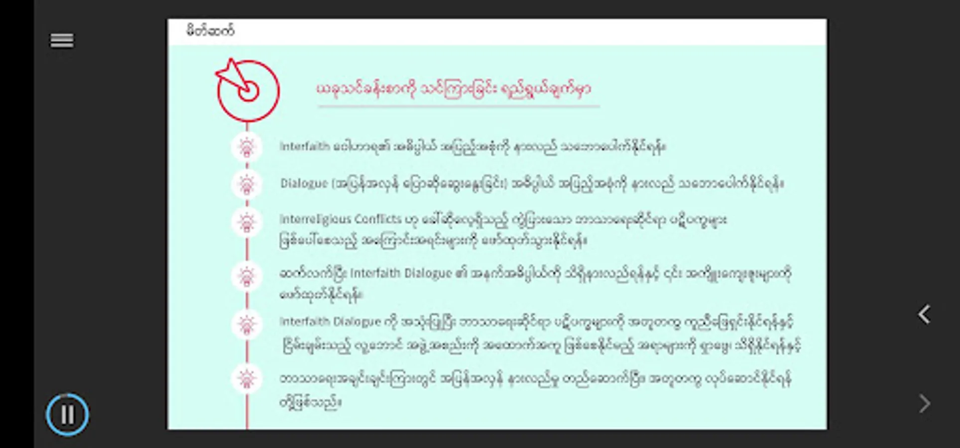 It is text-based, however, with an interactive learning journey. Each session of the course will step-by-step help the users to understand “Interfaith” and “its dialogue” with 6 main categories, delivered in multimedia ways. By the end of this one hour course, the users will be able to clarify and identify the common “hate speech” targeting multiple religious communities in Myanmar and cultivate kindness despite different notions in their religions.