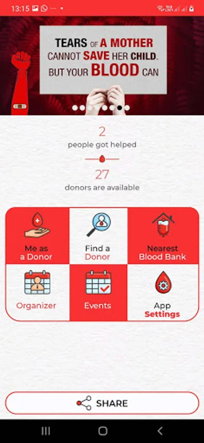 The Blood Donation app developed by Zabingo Softwares is made with a view to provide community service in mind and not any commercial gain. This application would serve the purpose of finding donors for particular blood groups as well as the blood banks with respect to the search parameters concerning the location/area. The app provides three basic features through which one can either register his/her name as a donor, find a donor for their need and find the nearest blood bank as well as access the settings of the app. Through this app, one can get the details (phone number and location) of the registered donors as well as the Blood banks searched on the basis of location).