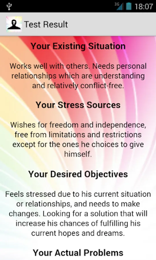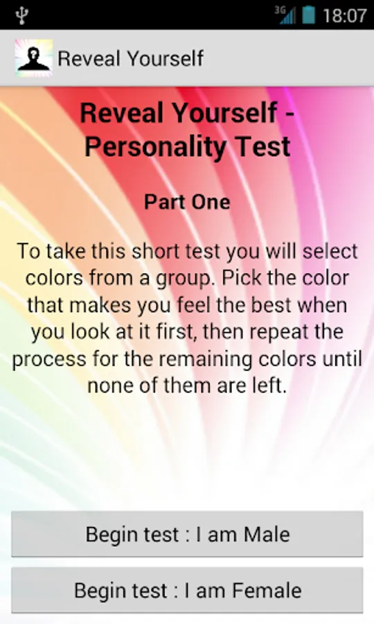 RevealYourself is a free personality test. Despite that it doesn't take more than 5 minutes, it is a "deep" psychological test, based on scientific researches of colour-diagnostic around the world. It is widely used by psychologists, psychiatrists, government agencies, and universities to screen their candidates. To take this short test you will select colors from a group. Because the color selections are guided in an unconscious manner, they reveal the person as he or she really is and not as he, or she would like to be perceived which occurs in ordinary tests. RevealYourself test measures a person's psycho-physical state and ability to withstand stress in current situation. The results of test are not permanent, they will be different if your psycho-physical state is changes.