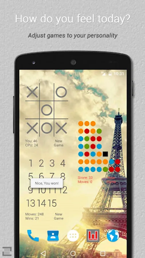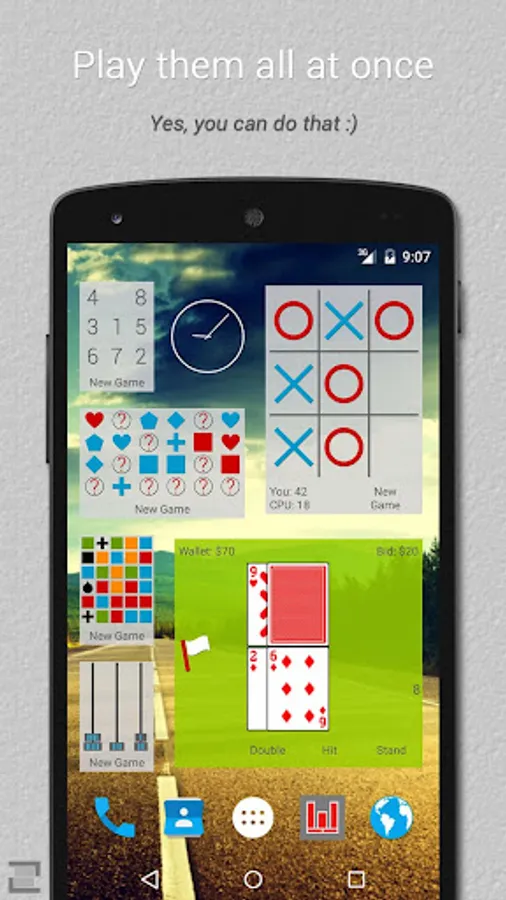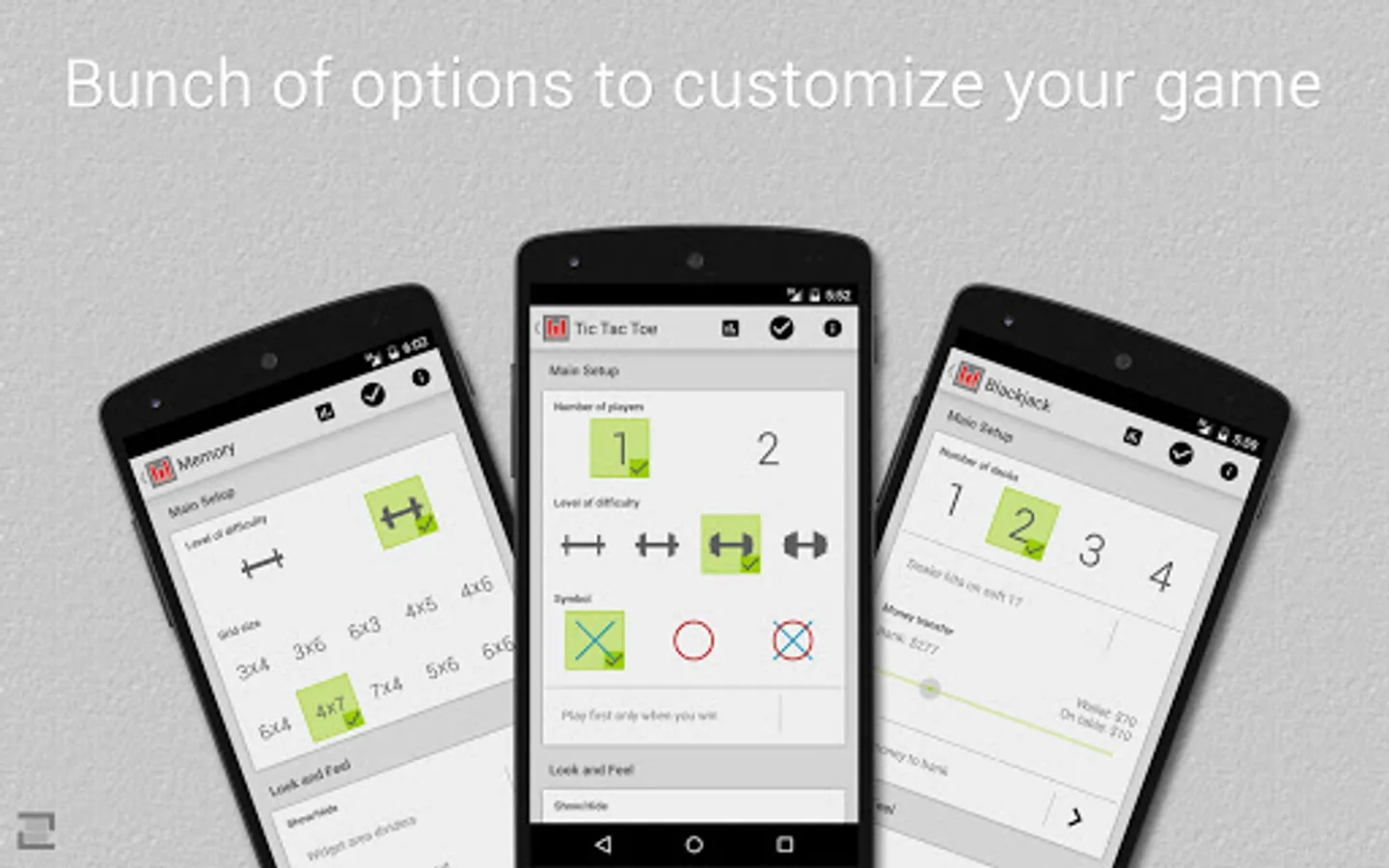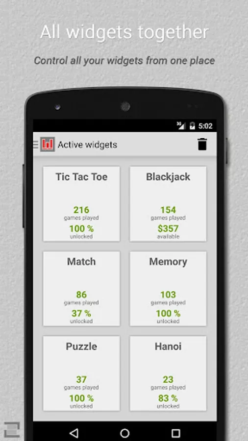 • 6 unique and beautiful widget games – Tic Tac Toe, Blackjack, Match, Memory, Puzzle, Hanoi