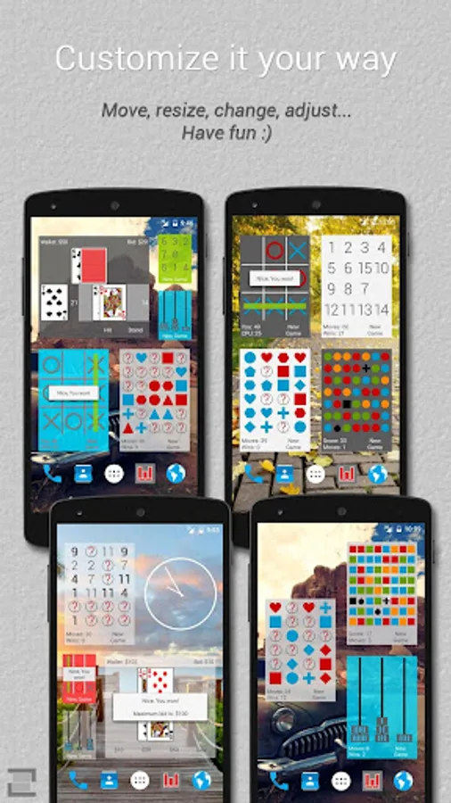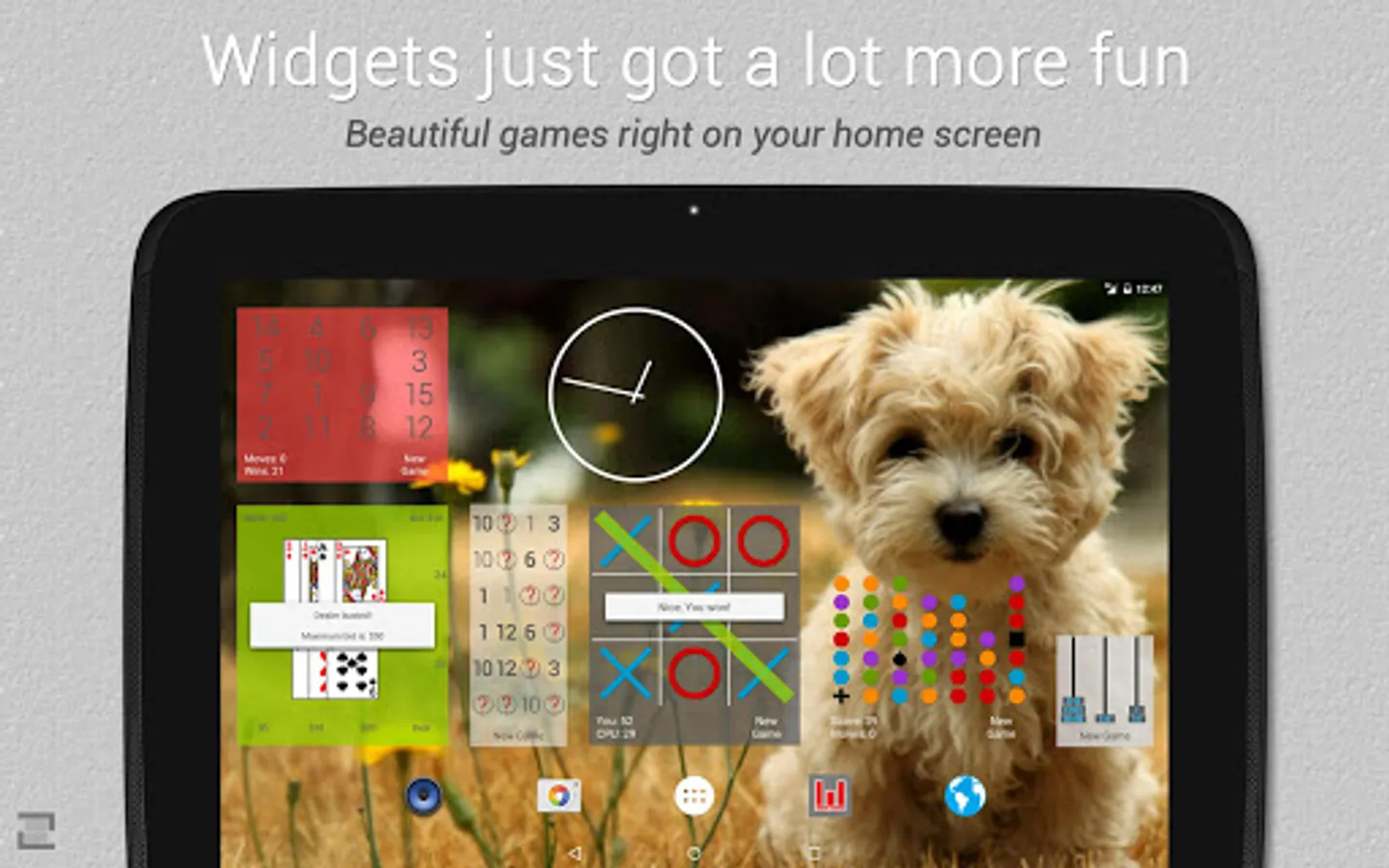 Widget Games contains 6 super fun classic games in form of beautiful interactive widgets that you play on your home screen. Thanks to various customization options available you can customize gameplay, look and behavior. You can also resize widgets to 1x1 size and play your game as small as icon, which makes them smallest games available for Android.