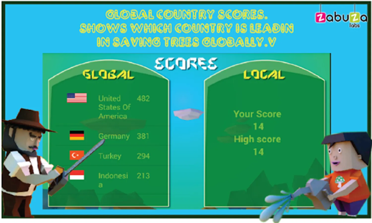 - Global score. Whatever you score, it gets added to the net score of your country. Here you can see which country tops in saving trees.
