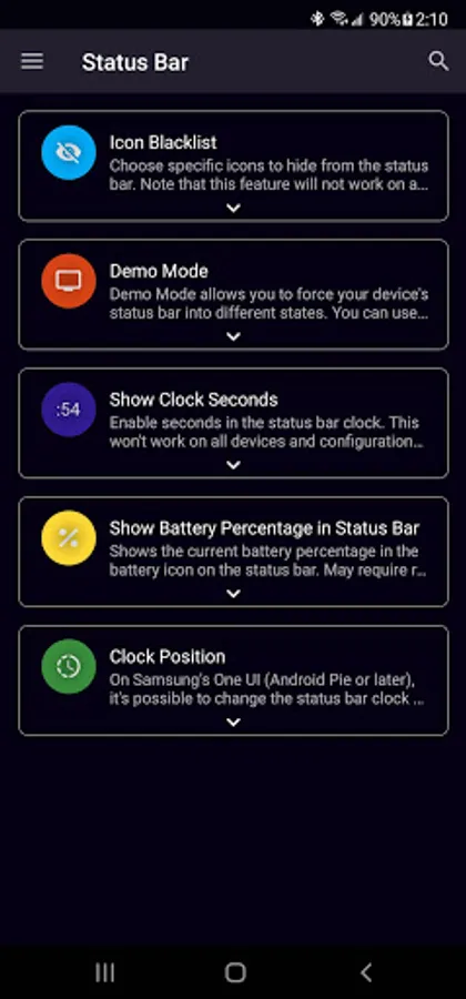 - Control which icons appear in your status bar (not every toggle will work on every device).