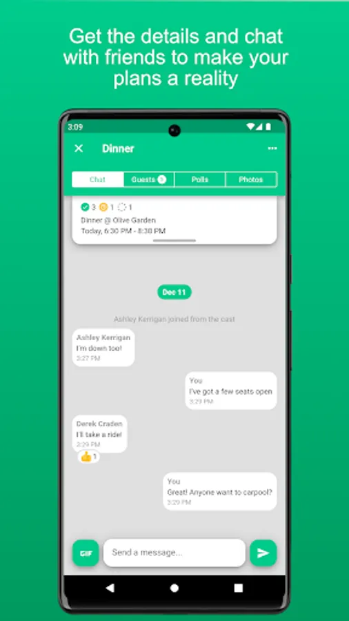 - Chat - Each Event has a dedicated group chat to help make your plans a reality and includes GIF support for a little extra fun.