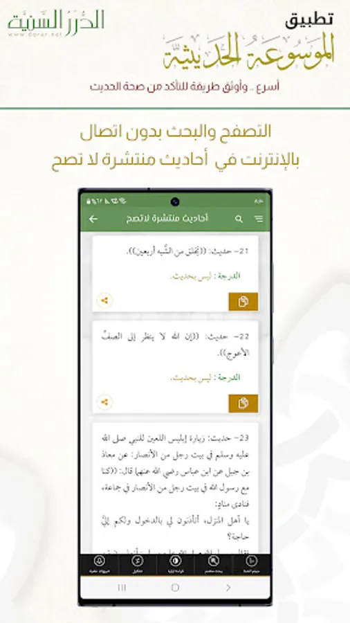 - A special section for widespread hadiths that are not valid, and the ability to browse and search them without an internet connection.