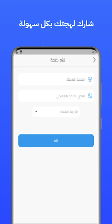 Add your accent easily by typing the word and its meaning in classical Arabic and choosing the country 🔵
