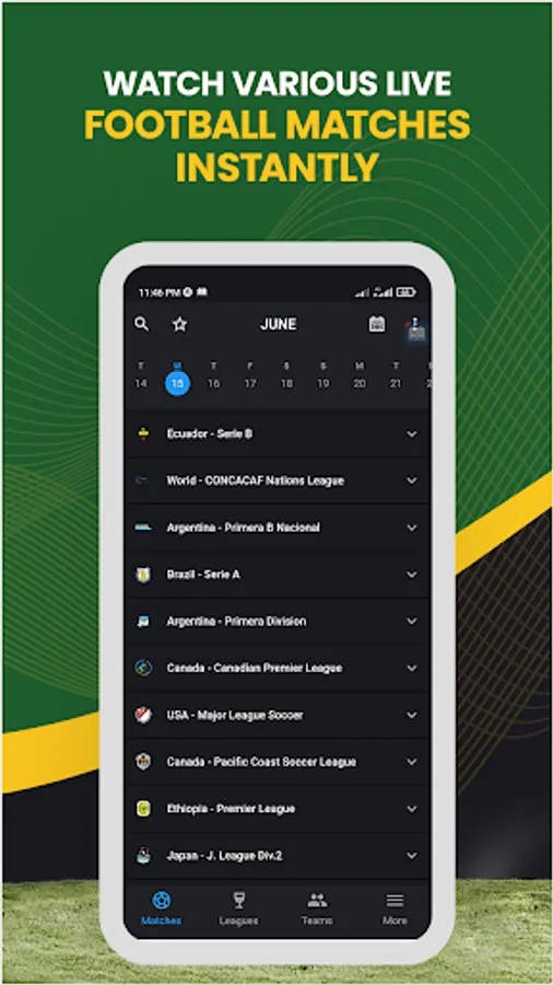 Now here is the details description about live football app. Here is four tabs at bottom of the app those are: Matches, Leagues, Teams and More.