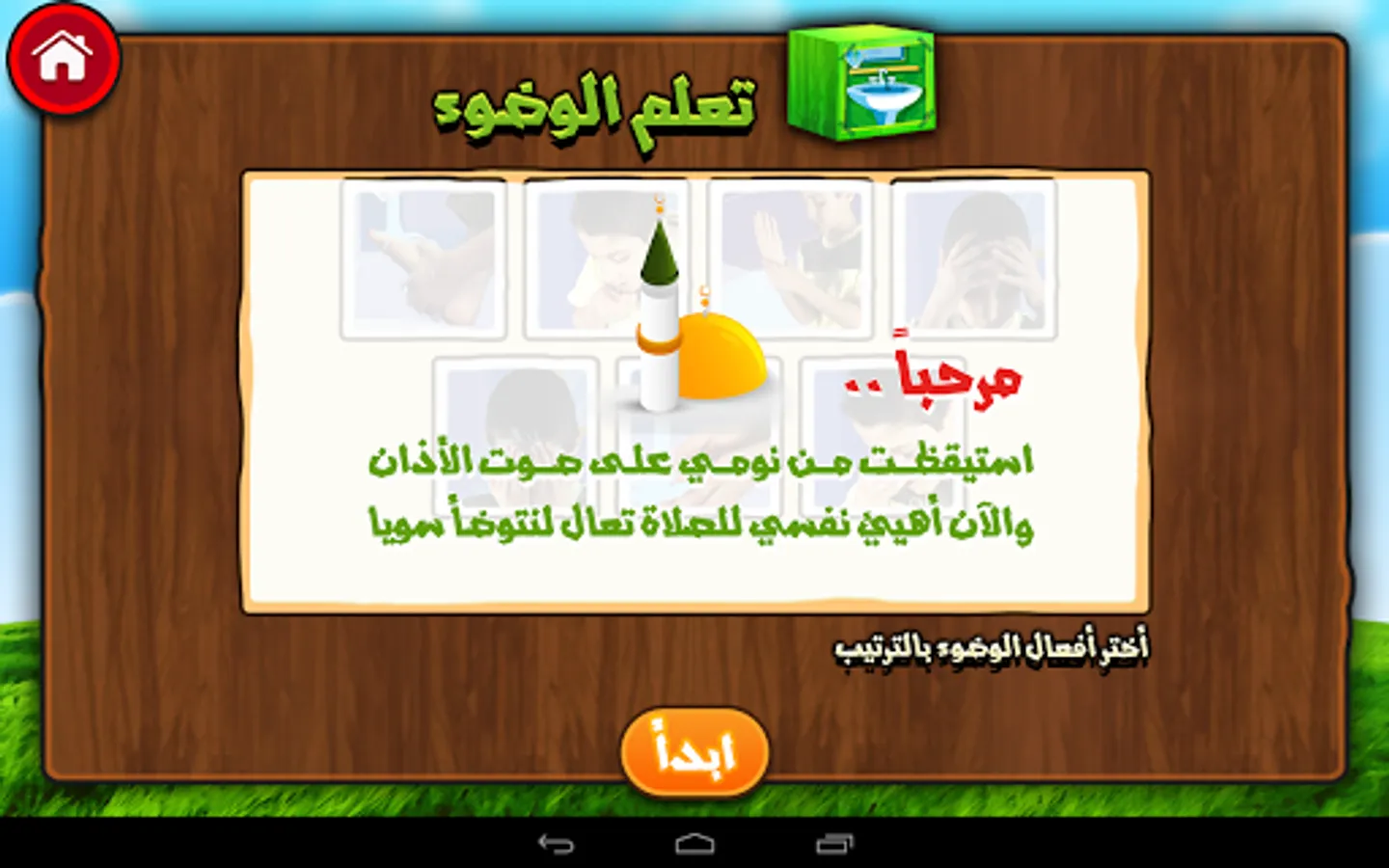 Prayer column of religion and corner Matin, which first asks for the Day of Resurrection, the pray peace for all his affairs, for this value of faith, a group increased developed the idea to create an application (Education ablution and prayer) so that aims to teach children recipe ablution and prayer simple fashion and display attractive, includes a range of electronic media, graphics and exercises that facilitate closer understanding of the small Muslim.