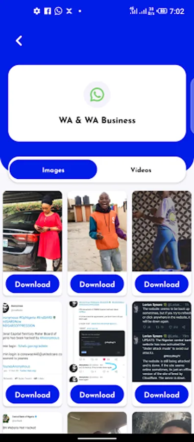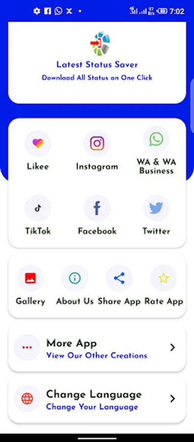 All in one status saver allows you to download/save every status in your mobile app. Save images status, Video Status from your favorite apps like WhatsApp, Instagram, Facebook, Tiktok, Twitter. All in One Status saver allows you to download all statuses in one single click.