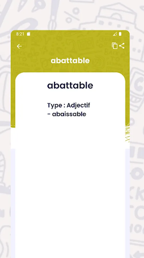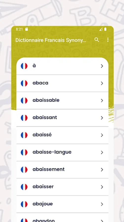 This application offers more than 52,000 French terms and synonyms. Finding the definition you are looking for is simple, type your term and get the synonym in French language. A favorites list is also available for often consulted words, as well as your search history.