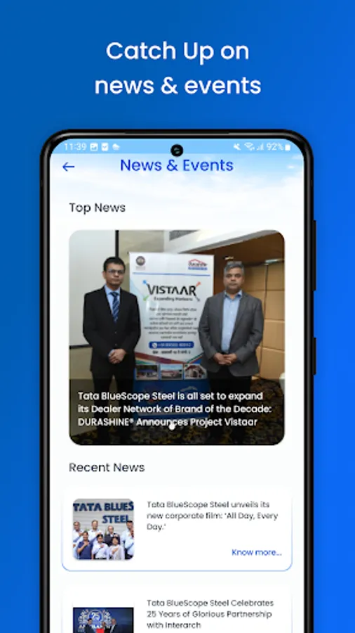 An app created for the employees, channel partners, customers of the Tata Bluescope Steel company. This is an app to capture the overview of the company, products, news and events, raise enquiry, leadership team and help the channel partners and customers locate the authorized dealers of the company and connect better with the company through various mediums.